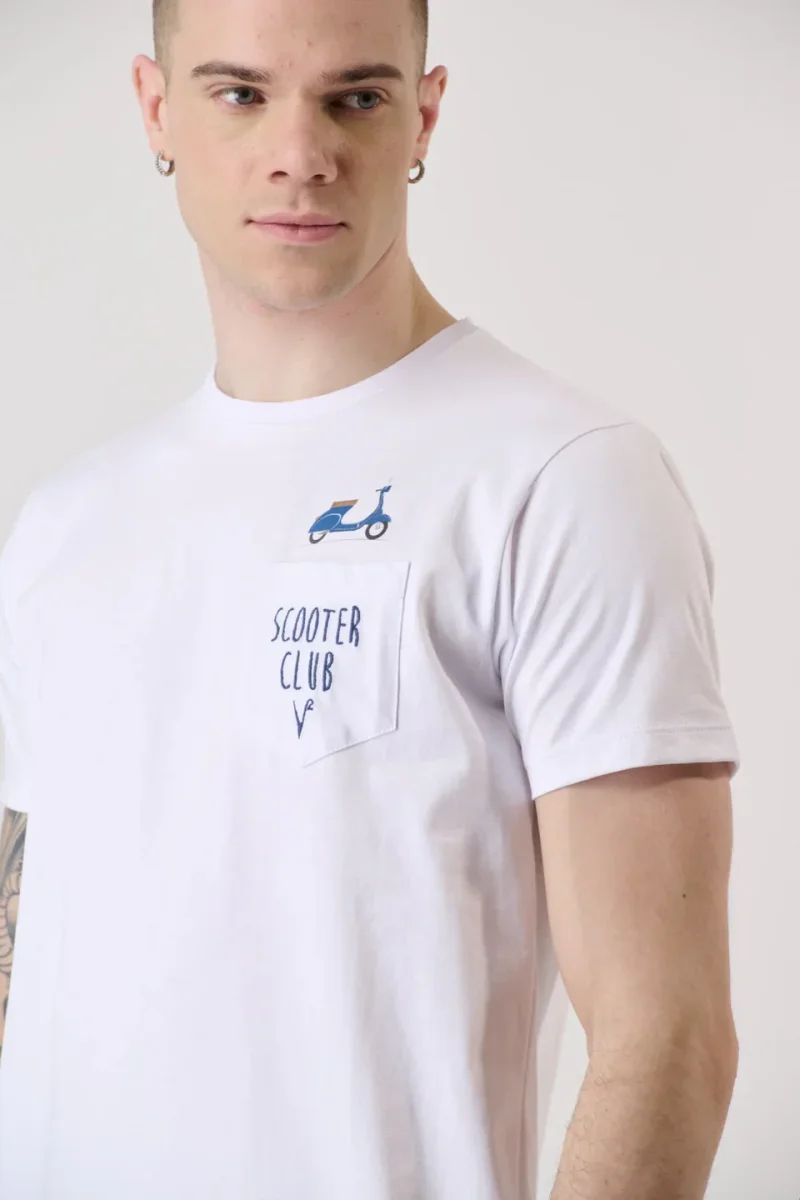 T-SHIRT BIANCA CON STAMPA, TASCHINO CON RICAMO E INTERNO COLLO IN TESSUTO – V2