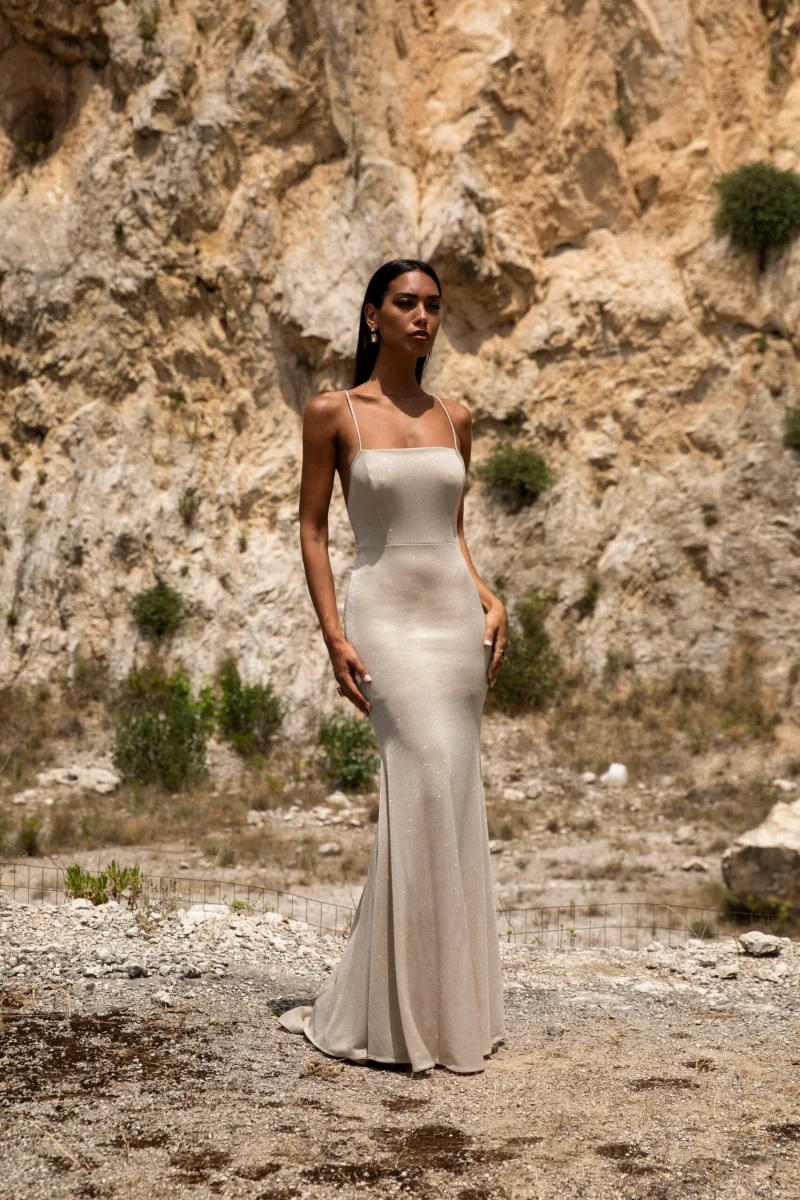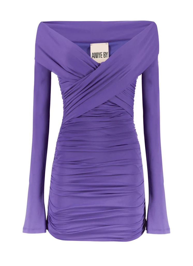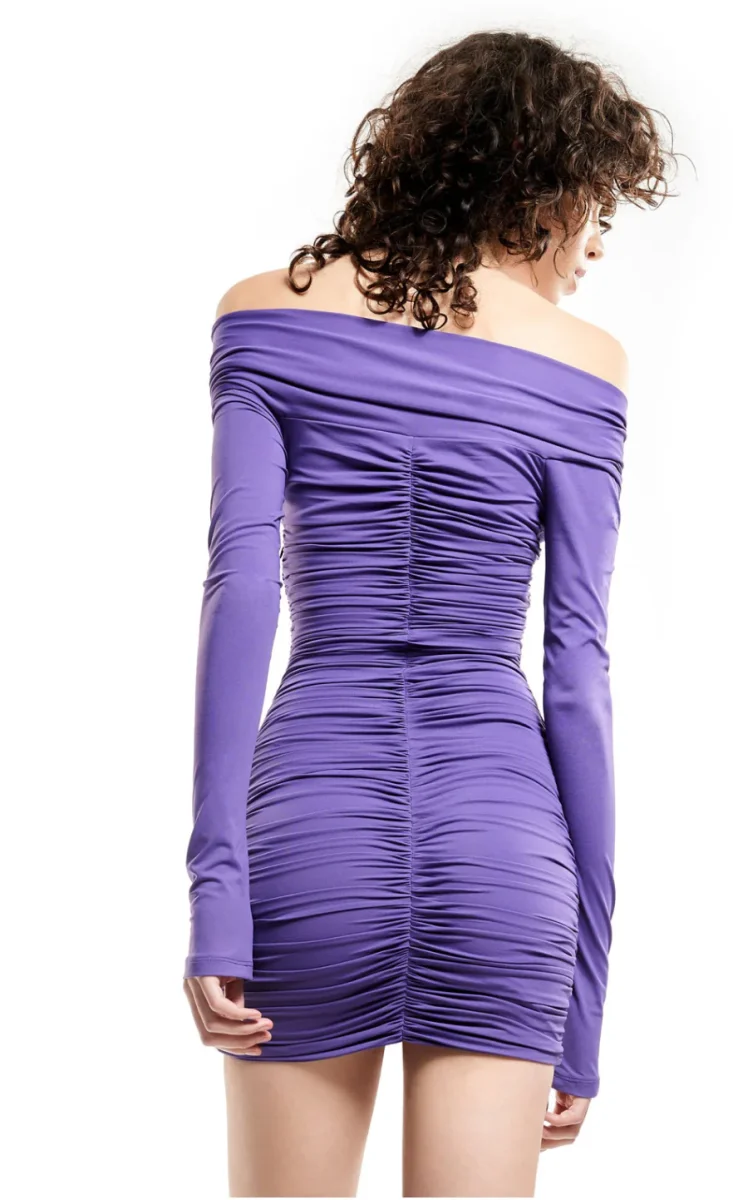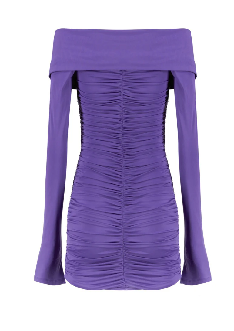 Abito corto e aderente, con maniche lunghe e spalle scoperte.