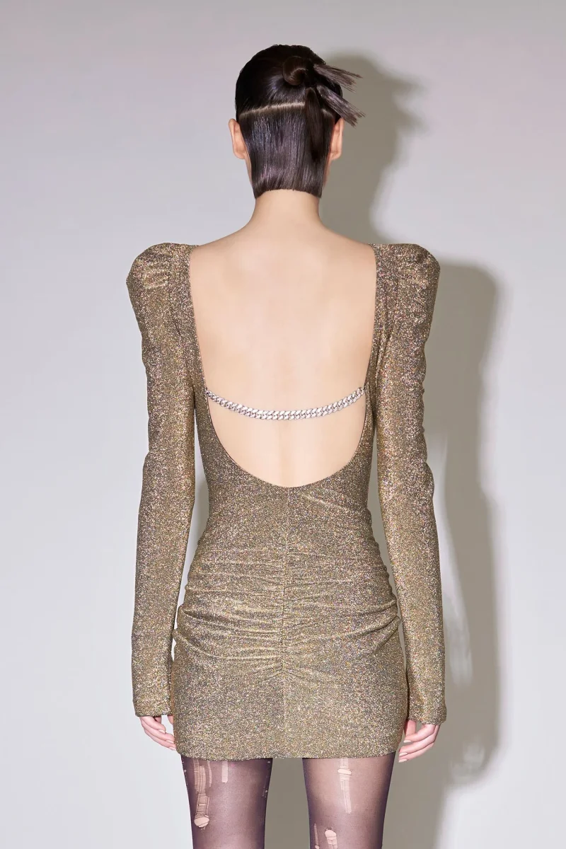 Mini abito aderente in tessuto jersey lurex con scollo profondo sulla schiena.