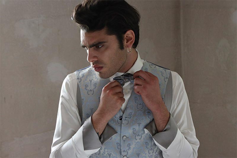 Osserviamo come le cromie dell’abito sposo uomo vengano esaltate dalle cromie degli accessori: un panciotto champagne solcato dal disegno carta da zucchero delicatamente abbinato ad un plastron double che esplora due toni di grigio perla impreziositi dallo stesso disegno carta da zucchero. Innamoriamoci della camicia in seta (51%) e cotone (49%) bianco latte impreziosita da applicazioni su collo e polsi in raso 100% seta color grigio mineral.
