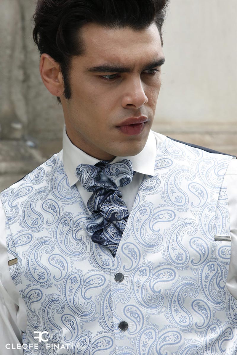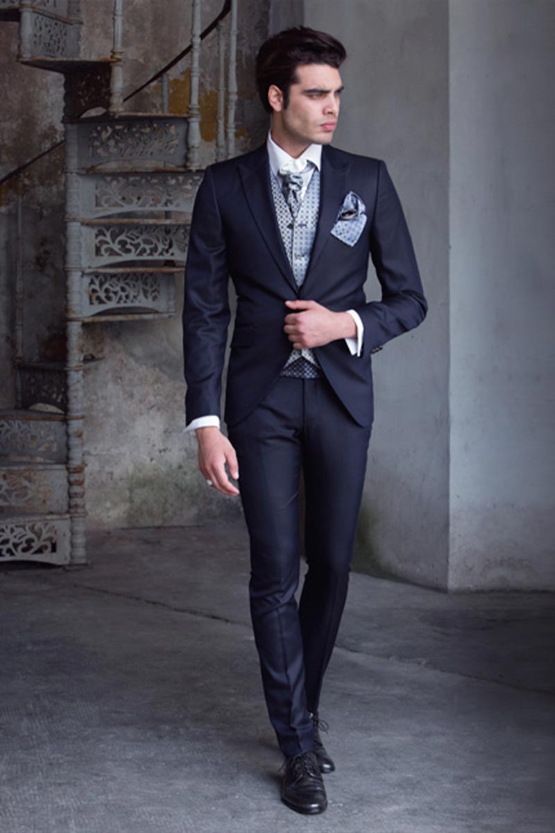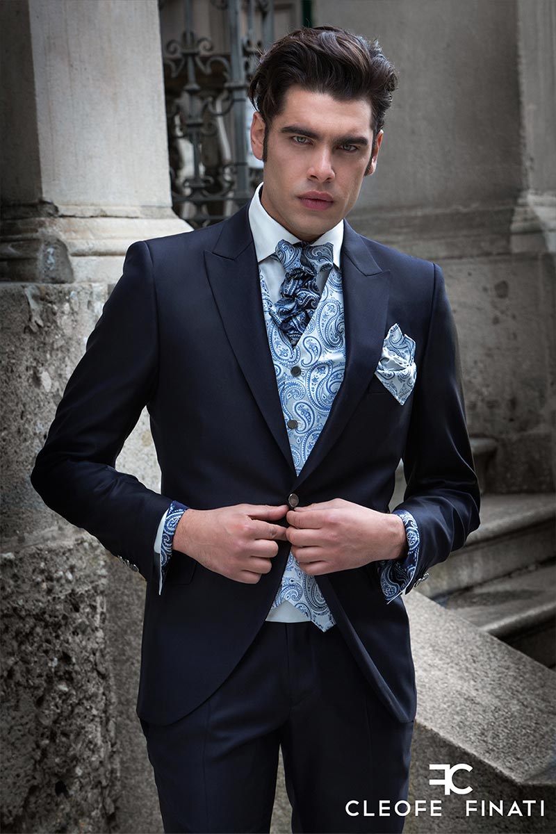 Osserva questo abito da sposo in raso di seta lana blu notte, dalla linea glamour e nel contempo classica. Giacca da uomo, stondata sul fronte con collo a lancia pronunciato ad un unico bottone. Guarda la bellezza del fronte giacca da sposo senza pinces, che nell’assoluta pulizia stilistica denota una indiscutibile ed elegante ricercatezza e nel contempo grande competenza modellistica. Il tuo corpo sarà disegnato ed enfatizzato da questo meraviglioso completo da uomo a firma Cleofe Finati. Innamorati ora del tessuto, un raso di seta lana blu notte. La tessitura ad intreccio raso richiede il filato di maggior pregio perchè a tramatura scoperta. I tessuti da capospalla a firma Cleofe Finati sono tessuti naturali esclusivi della maison, provengono tutti dal biellese, dove si realizzano da sempre i tessuti italiani pettinati di più alto pregio per gli abiti da uomo. Entra ora nel cuore della creazione e indossa un panciotto in broccato di seta made in Italy 100%, ti innamorerai del disegno che diviene strappo e nel contempo pois sgranato, legato in intrecci che simboleggiano l’incontro d’amore. I tessuti dei tuoi accessori a firma Cleofe Finati, sono sia in catena che in trama di seta, guarda la loro luminosità garbata e densa.Questa è una caratteristica importantissima per la bellezza dei tuoi accessori, anche per il gilet da uomo; spesso l’etichetta seta pura (e basta) non ti garantisce che il tessuto sia in seta 100% (la catena infatti, che è il 70% del tessuto, viene realizzata spesso in polyestere o acetato).Invece tutti i tuoi accessori Cleofe Finati riportando nelle loro etichette seta italiana 100% ti garantiscono la composizione totalmente in seta pura.Guarda e innamorati della camicia. Il suo corpo asciutto accarezza la pelle con un raso morbido di seta e cotone che nel contempo ti illumina. Il collo alla francese di questa camicia da uomo, da poter portare aperto o allacciato fino all’ultimo bottone, è personalizzato e dunque impreziosito, da una pistagna in broccato di seta con contrasto cromatico, che insieme al polso, anch’esso personalizzato, diventano elementi importanti nel total look di questa meravigliosa creazione a firma Cleofe Finati. La scelta della cravatta caratterizza l’artigianalità del creare della maison. La cravatta come accessorio da collo enfatizza la verticalità del corpo e nel contempo ci fa comprendere come questo vestito da uomo possa essere riutilizzato anche nel total look in qualunque occasione. Non dimenticare le scarpe a firma Cleofe Finati. Le scarpe da uomo, oggi, sono un elemento fondamentale dell’uomo di classe. Le cromie, i pellami e le forme delle scarpe da uomo Cleofe Finati, regalano al mondo e a te dei veri gioielli. Una creazione dunque dedicata ad un uomo di classe che ama il bel vestire, scegliendo dei begli abiti da uomo ma nel contempo anche un’immagine glamour, che vuole essere elegante ma anche enfatizzato nella propria bellezza, in sintesi un’opera che risponde all’uomo di oggi.