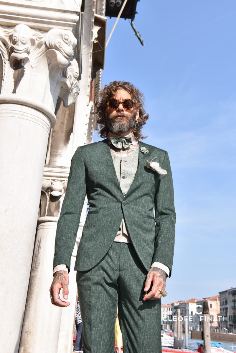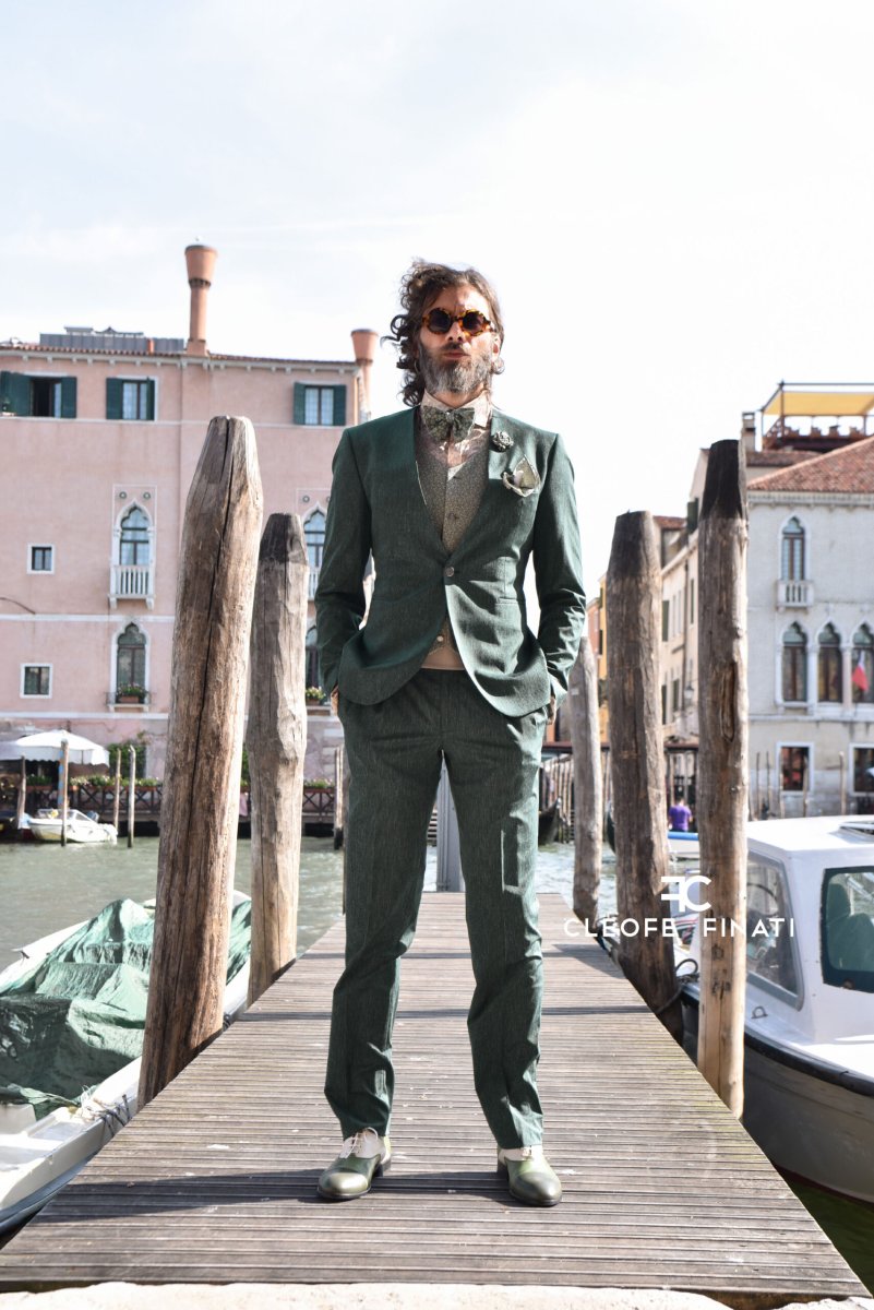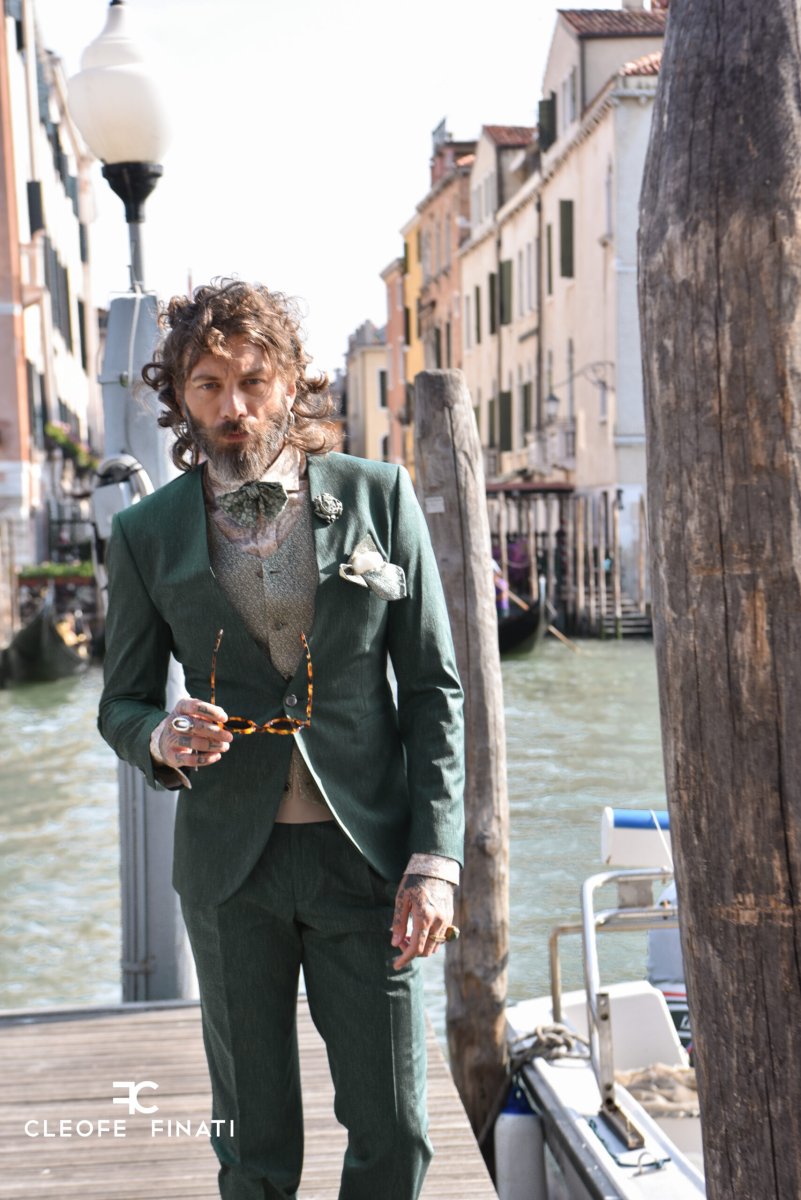 Eleganza pura, contraddistinta dai dettagli, rende questo capo uno dei più rappresentativi della collezione. Raffinatezza sartoriale per uno stile unico. Un abito da sposo esigente ma al tempo stesso equilibrato. Una definizione che racchiude l’essenza di questa creazione della maison Cleofe Finati. Un outfit che coniuga gusto e tradizione con carattere, grazie al mix di cultura inglese e innovazione. Giacca couture con profondo scollo a V e un solo bottone. L’unicità di questa creazione risiede nell’assenza del colletto tradizionale, che cattura immediatamente l’attenzione sugli accessori a contrasto. Il retro di questa giacca è un capolavoro: presenta una piega su ogni lato, che parte dalla cucitura della spalla sopra la scapola fino alla vita incontrando una cintura cucita e termina con due spacchi laterali. Il bordo inferiore della giacca è leggermente arrotondato e segue una linea curva. Questo abito da sposo presenta una zona delle spalle stretta e un giromanica alto, tipico di Cleofe Finati con maniche sottili ornate da quattro bottoni aperti alle estremità. La giacca è abbinata a pantaloni ampi e a vita alta che, grazie alle doppie pieghe, modellano la figura di chi li indossa e aggiungono un tocco ancora più raffinato. L’abito da sposo è realizzato con un impressionante gioco di sensualità dei materiali, che si riflette in sottili e delicate graffiature in tutto l’outfit. Il colore, un verde foresta di tendenza, è realizzato in seta-lana-elastan (80% lana, 18% seta, 2% elastan). Le caratteristiche di questo tessuto sono un meraviglioso drappeggio, una finitura opaca, una caduta perfetta e il comfort, ideale sia per la giacca che per i pantaloni. Un abito da sposo innovativo ma lussuoso, grazie alle linee storiche e moderne della giacca e dei pantaloni. La bellezza e la potenza del gilet con una scollatura sottile, realizzato in broccato di seta micro-meadow con un aspetto floreale, sono inconfondibili, con le stesse tonalità che compaiono anche nella cravatta e nel papillon. Un nastro di raso color crema e le bretelle aggiungono un accento extra, per non dimenticare il sottile fiore in tessuto. Completa l’insieme la camicia in raso di seta (51%) e cotone (49%) con motivo paisley, una delle nostre creazioni che non mancherà di fare colpo.