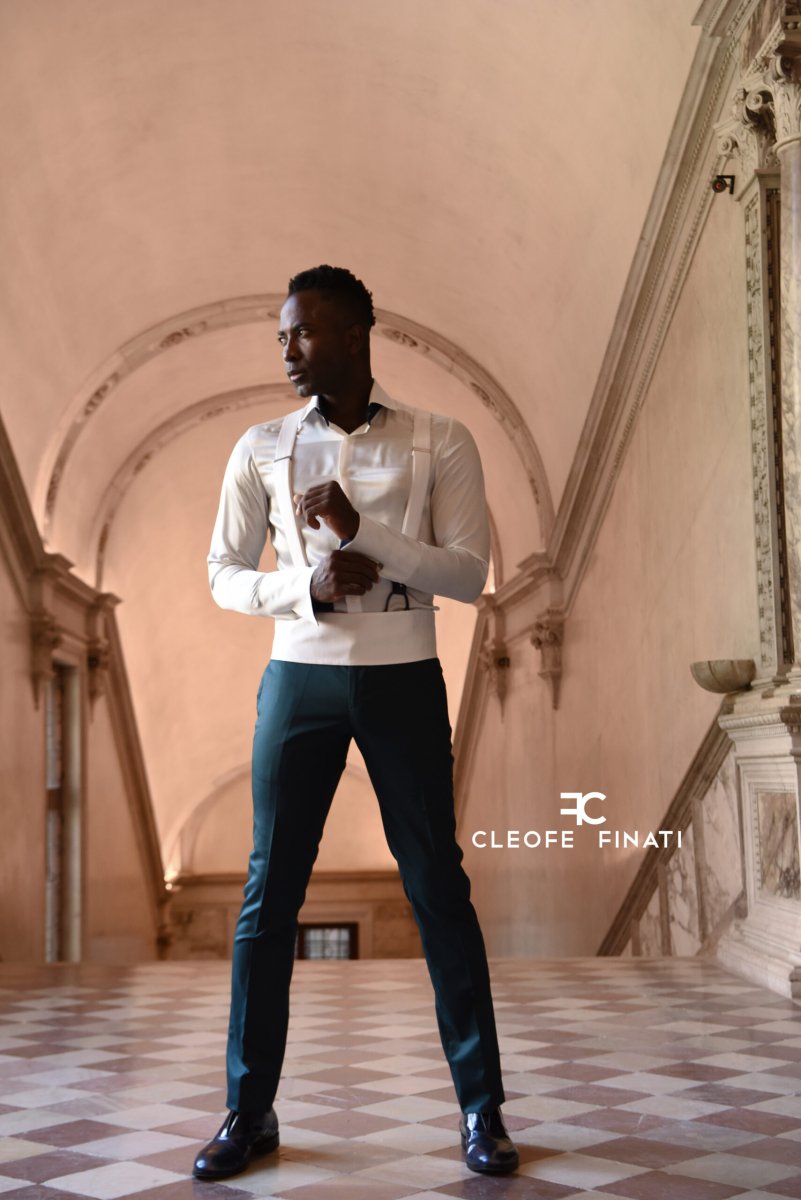 Una bretelle (per la caduta perfetta del pantalone e anche glamour), la cinta vita e la cravatta in RASO, 100% seta