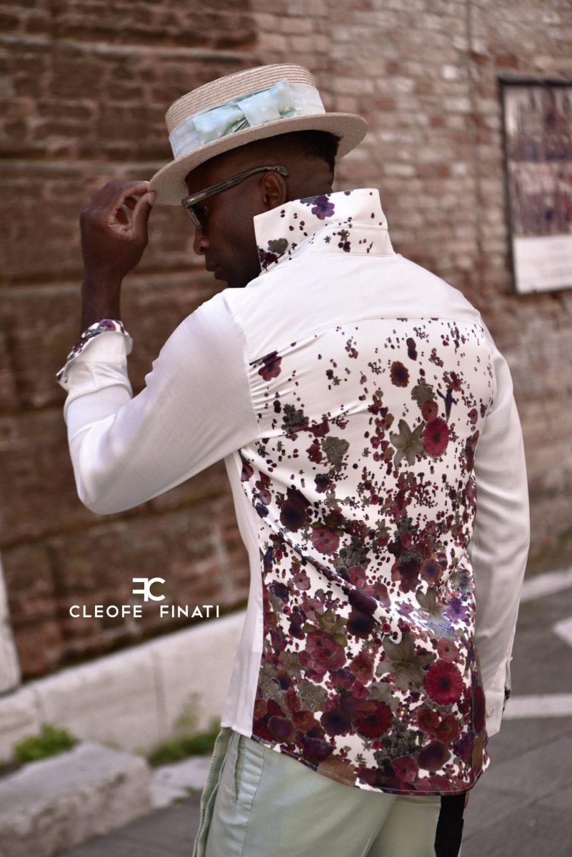 Innamoriamoci della particolarità della camicia in raso 100% seta bianco latte, una calma pulizia apparente che nasconde anche i bottoni con la sua copertura e ci meraviglia rivelandoci la stampa floreale ispirata a Kiki Smith su tutta la schiena, nell’interno polso, nella pistagna interna, esterna e nel sotto collo e regala la possibilità di stupire e ottenere diversi look nel giorno del matrimonio.