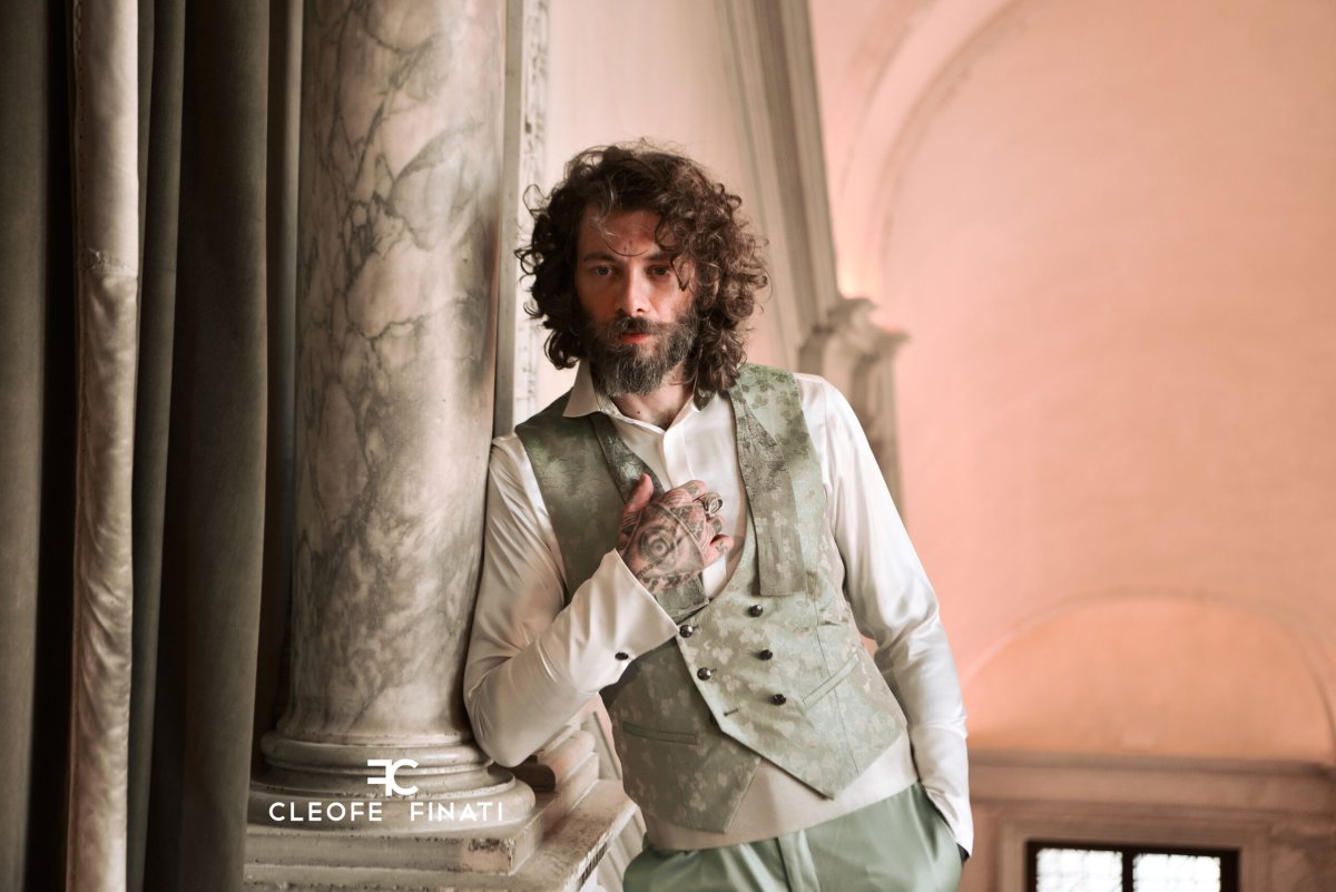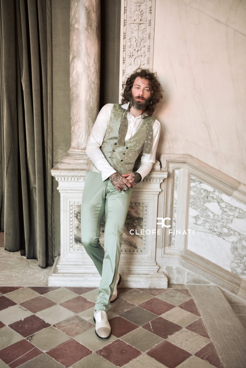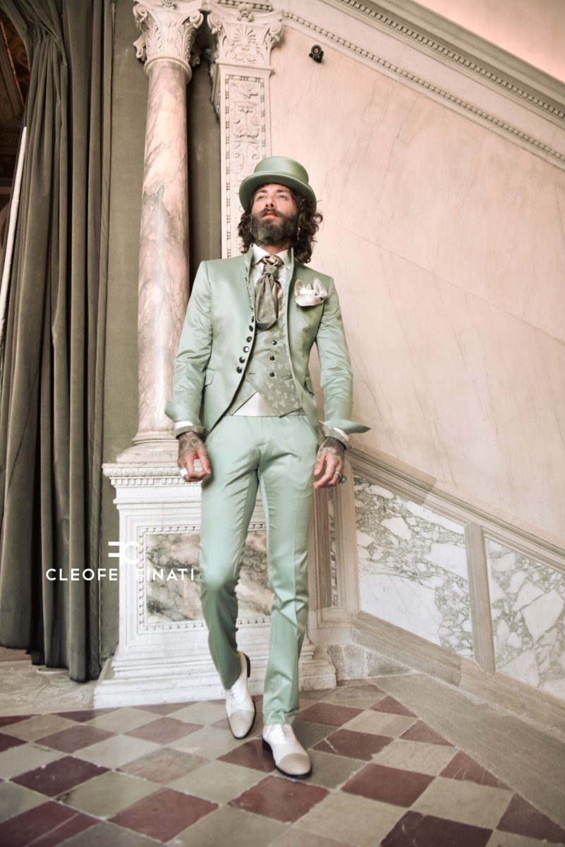 Osserva questo abito da sposo di raso seta lana verde tiffany, dallo stile divisa.
