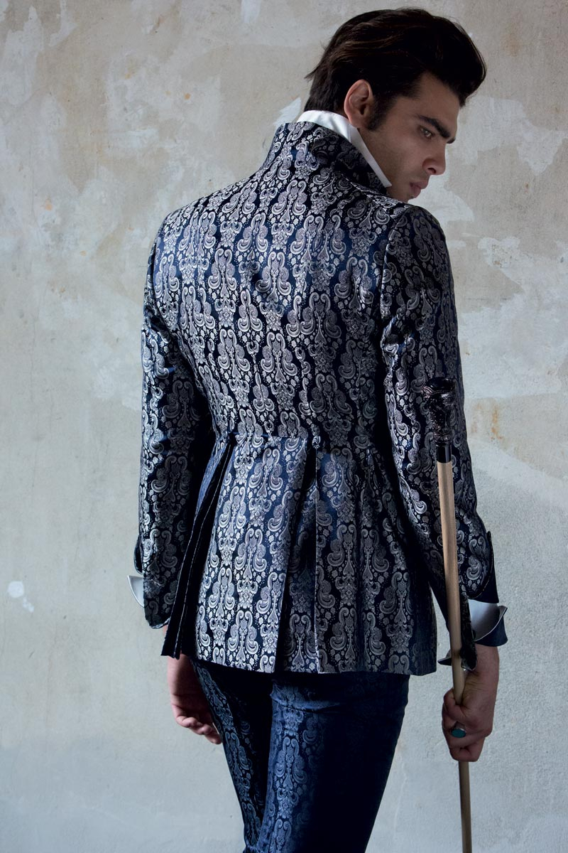 Ora indossa il panciotto e ammirati, è bellissimo sul tuo corpo, con il suo prezioso broccato di seta blu notte perfettamente abbinato al pantalone. Una vera opera d’arte impressa sulla stoffa.