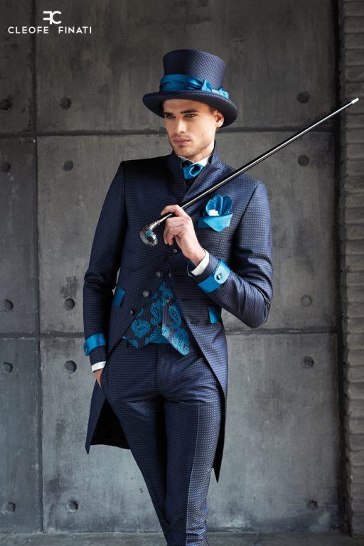 Continua, dunque, l’esplorazione del tuo abito, scopri il broccato che personalizza il gilet, quadrettato su toni grigio antracite e blu, solcato da maxi disegni paisley color turchese, che divegono ali di farfalla dai richiami.