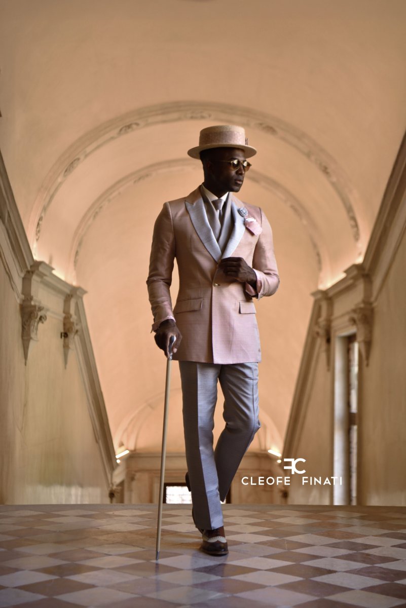 Questo è dunque un abito da uomo rifinito in maniera del tutto innovativa e molto ricercata, grazie anche ad un cappello buster in feltro.