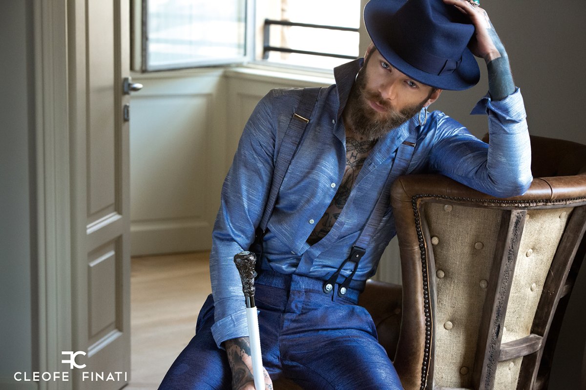 L’opera è completata da un cappello bogart in feltro grigio ed un bellissimo bastone con asse in pelle bianca, impreziosita da una borchia circolare in smalto bianco solcata dal logo Cleofe Finati.