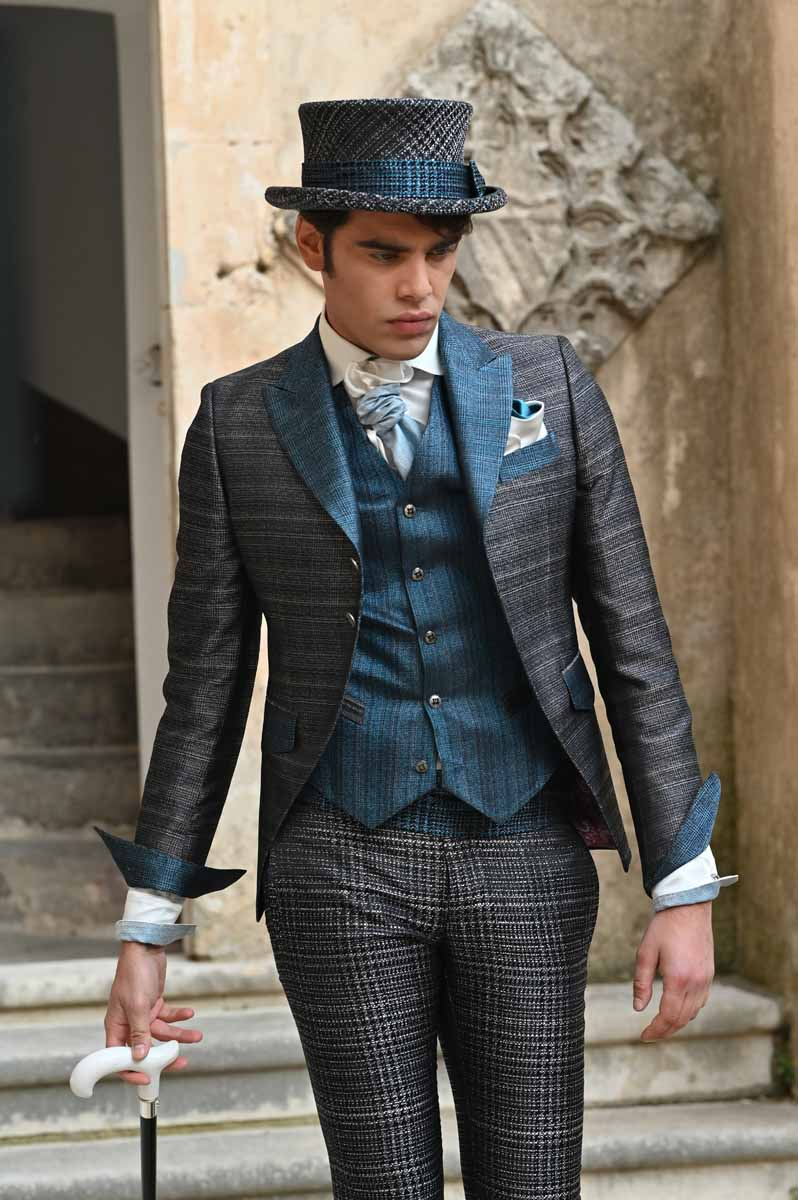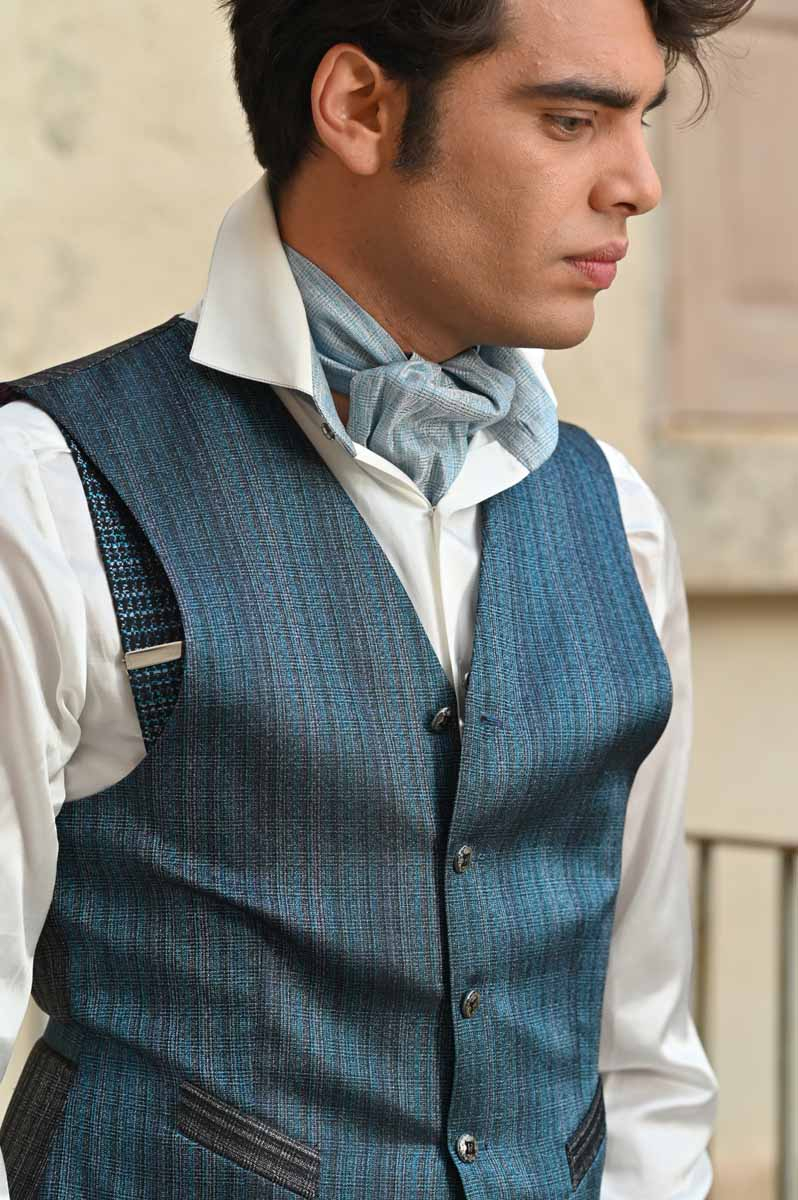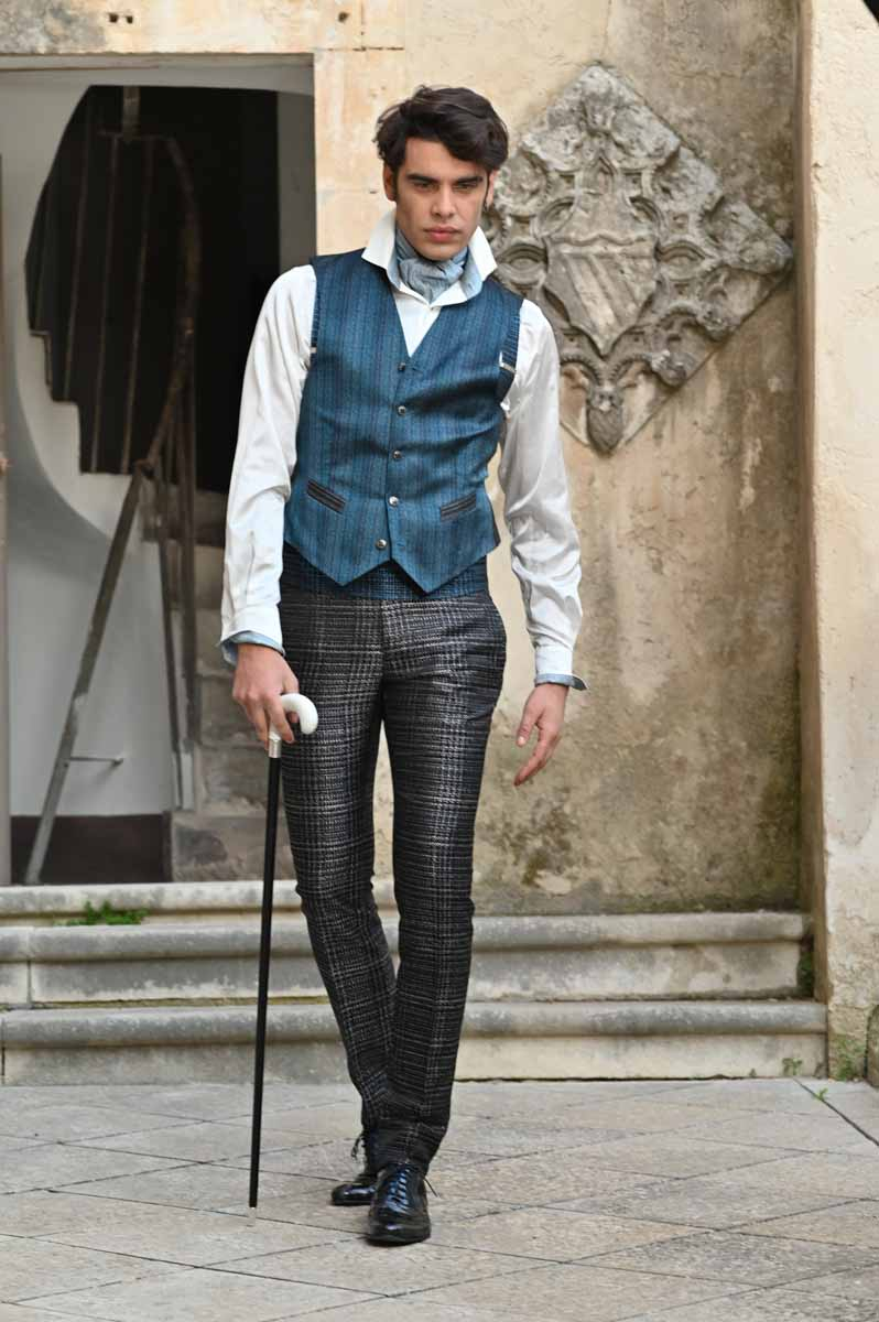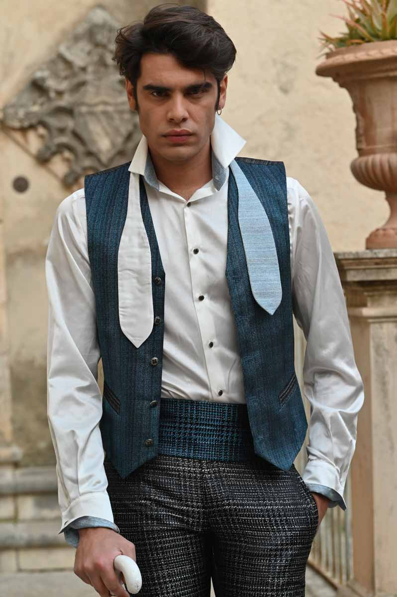 Il panciotto rielabora le cromie dell’abito proponendo sul davanti la variante azzurro petrolio, mentre la schiena si abbina al tessuto della giacca sui toni del nero.