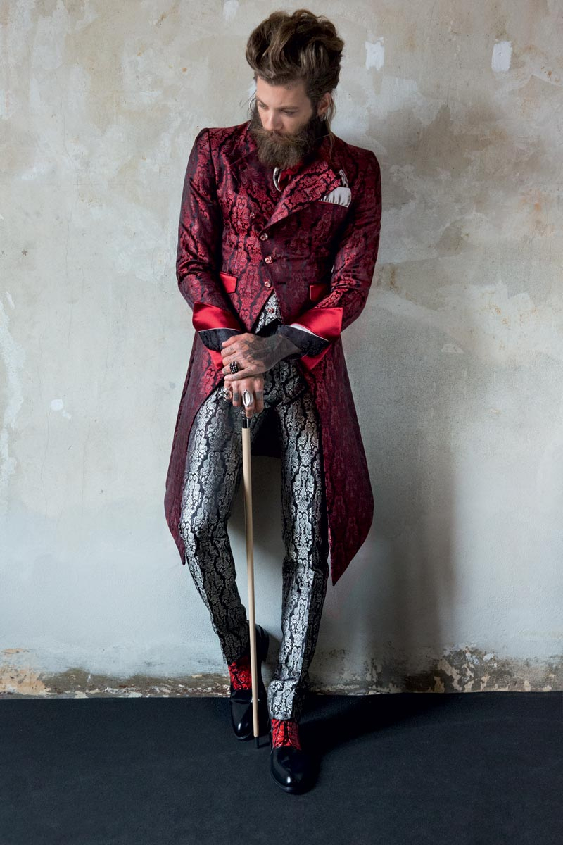 Immergiti nella bellezza del disegno attraverso i sottili intrecci del broccato 100% seta del disegno rosso rubino su sfondi nero inchiostro dell’abito da cerimonia uomo, arricchito da raso rosso rubino 100% su patte tasche, taschino e interno polso.