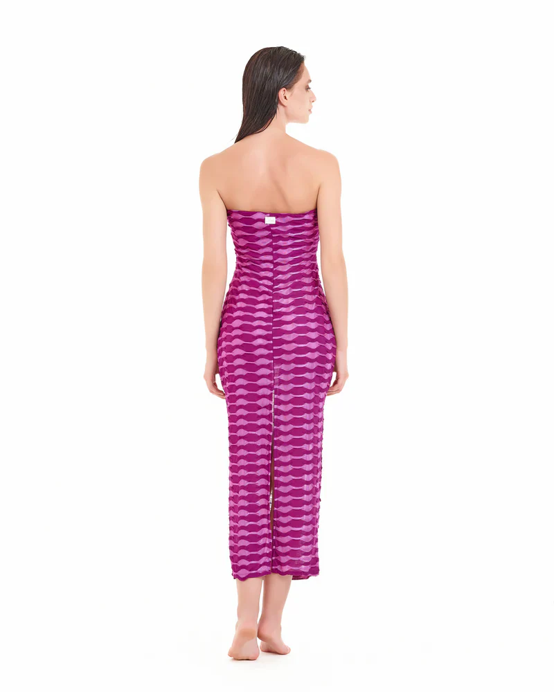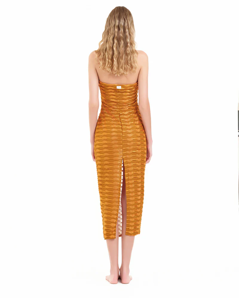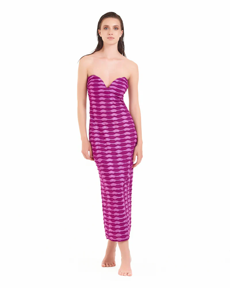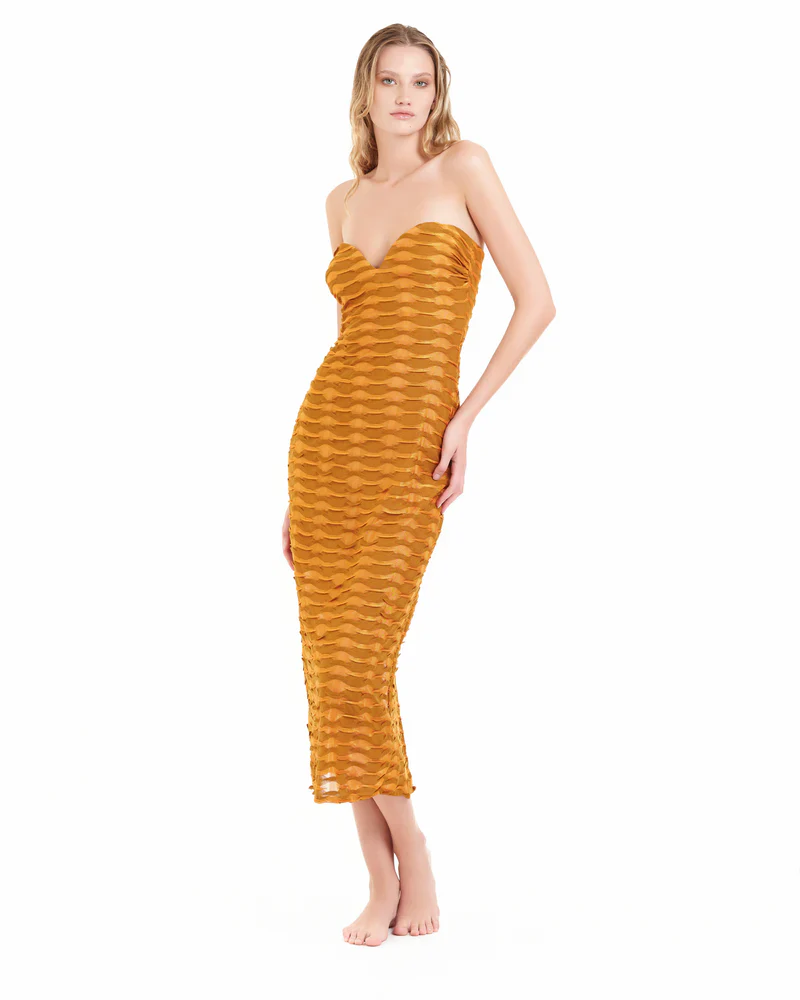 L’abito lungo della linea “Dune” con scollatura bustier a cuore aderente è un capo elegante e sensuale, perfetto per eventi formali o serate speciali.