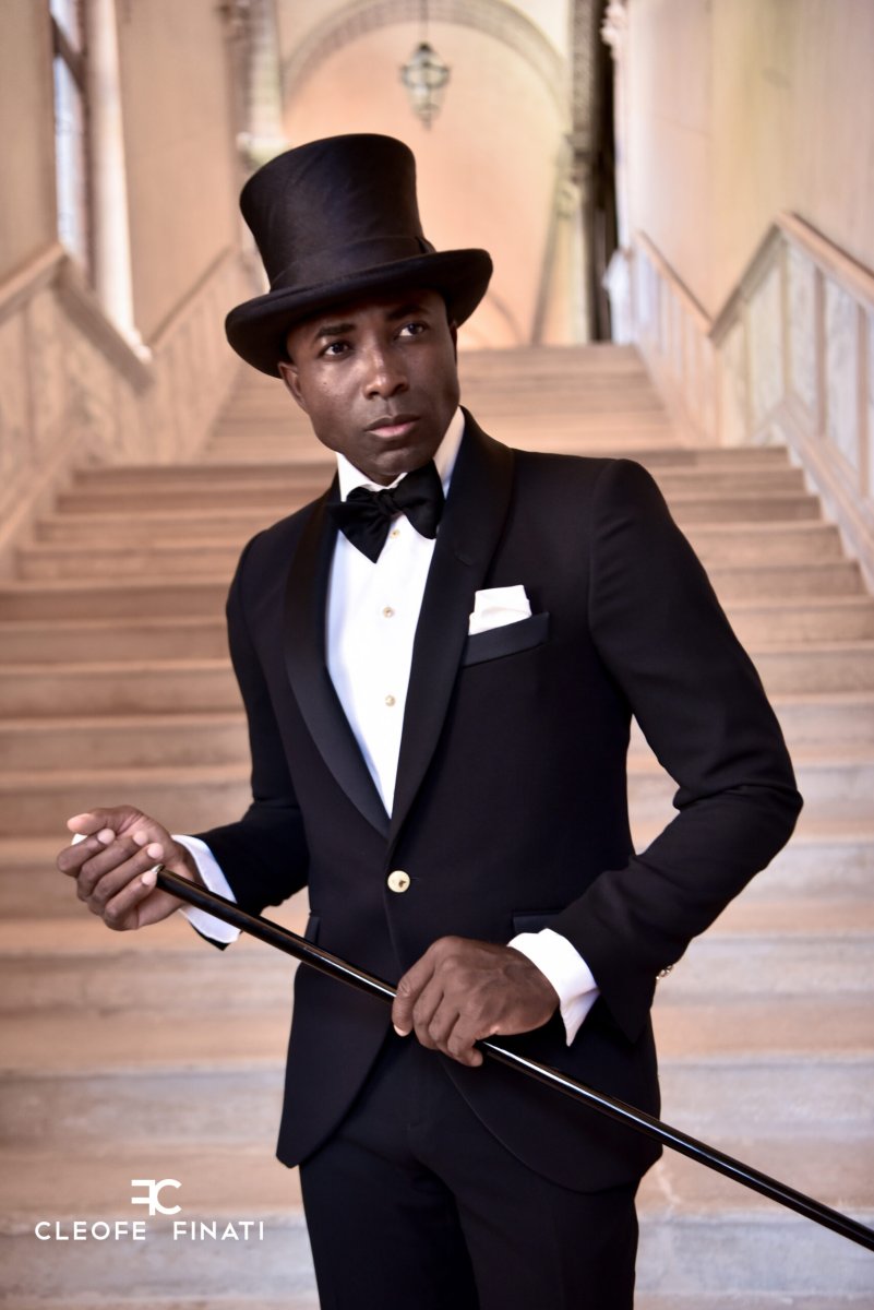 Smoking taglio classico con giacca mono petto a un bottone con collo a scialle, revers in contrasto nero e banda laterale sul pantalone di colore nero o blu notte.