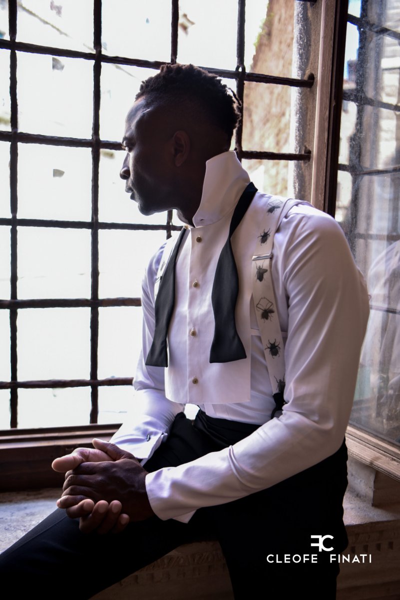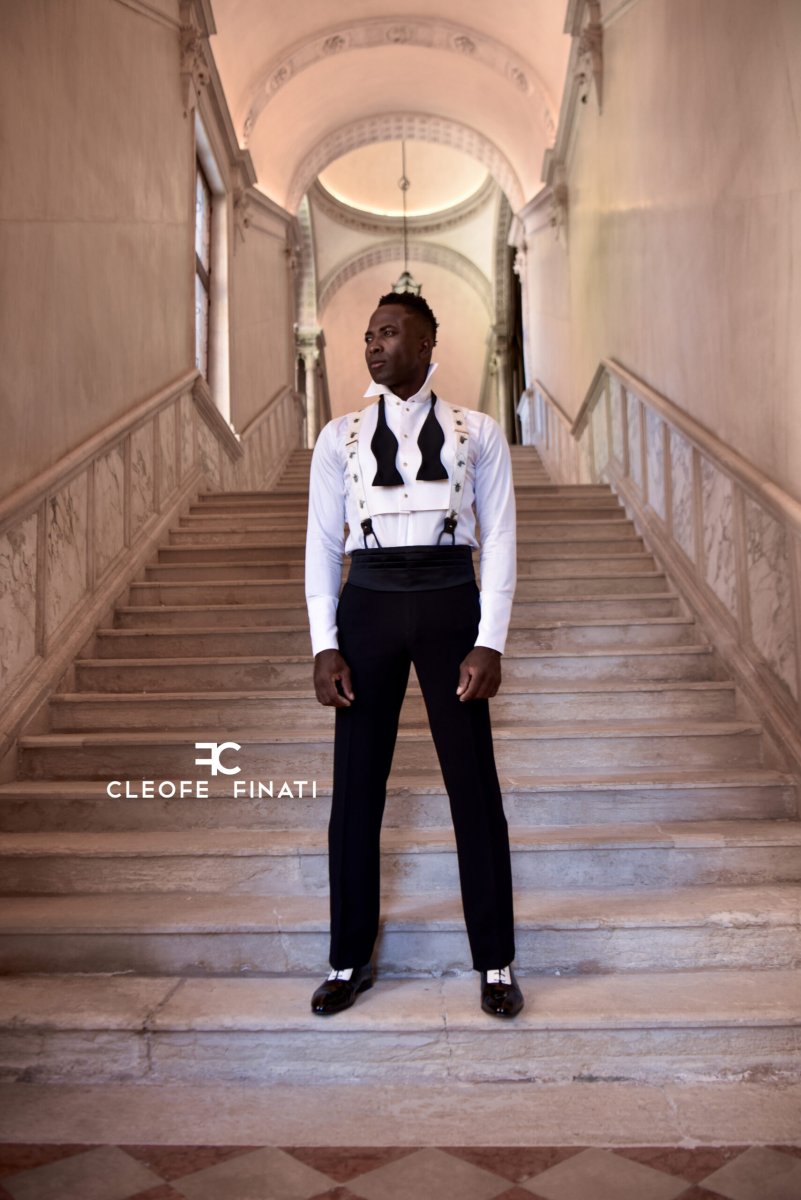 Fascia smoking a quattro pieghe con taschino porta soldi e balene interne, bretelle nere, papillon a nodo vero.