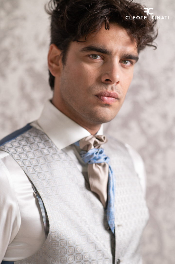 Il panciotto, monopetto a cinque bottoni, è realizzato in un broccato 100% seta dal disegno geometrico romboidale, nei toni grigio chiaro e madreperla, con retro in azzurro a perfezionare il quadro di estrema ricerca. Cintavita e bretelle riprendono disegni geometrici in cromie tenui e luminose.