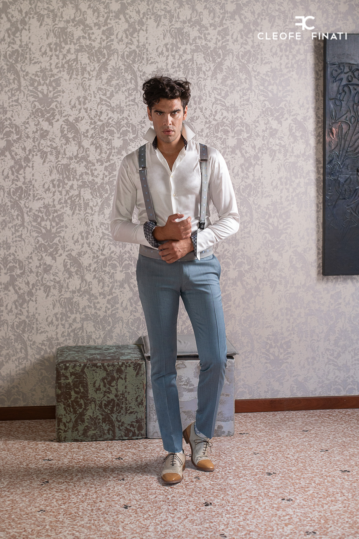 Una nuova interpretazione di eleganza glamour per lo sposo Cleofe Finati. La purezza delle linee sartoriali incontra cromie luminose e raffinate, regalando a questo abito uomo verde azzurro couture un carattere fresco e distintivo “COLOR QUERCIA LAVATA”.