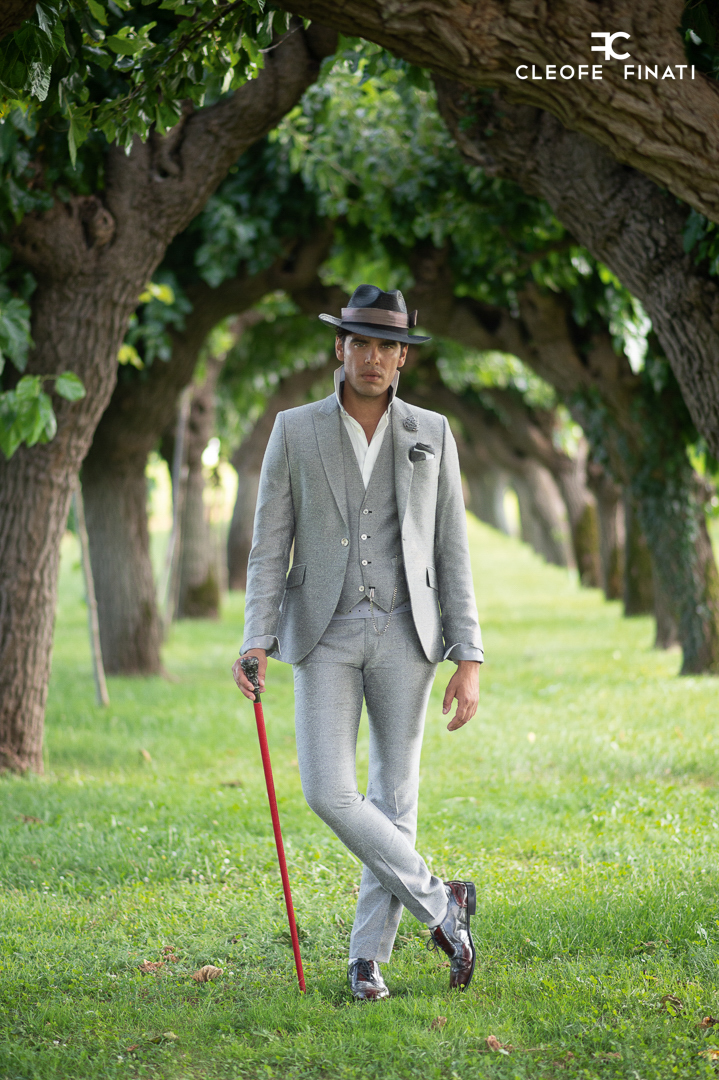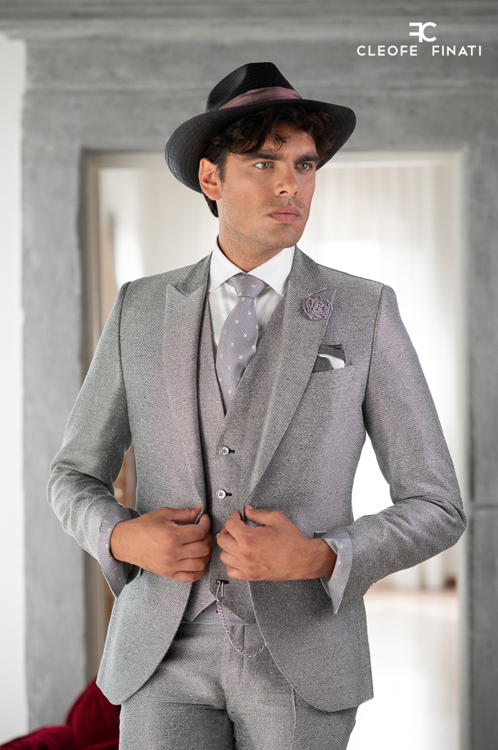 Incantevole il tessuto in seta /cotone, un elaborata creazione a “maglia” simile a rete d’argento mescola e intreccio esclusivo creato nella Maison Cleofe Finati. Raffinata nuance grigio perla mélange, che illumina giacca e pantalone dal taglio asciutto e slanciato. Le cromie neutre, eleganti e intramontabili, vengono armoniosamente esaltate dal panciotto nello stesso tessuto della giacca e del pantalone. L’abito grigio chiaro è un trend assoluto del momento.