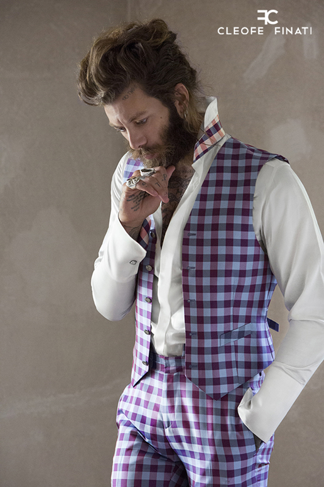 Osserviamo gli abili tagli sartoriali che scolpiscono la schiena, i due tagli centrali vengono accentuati da due bottoni sul punto vita che divengono faldoni con spacco a rimesso con abbottonatura nascosta donando enfasi e movimento alla camminata. Osserviamo ora il tessuto che compone l’abito cerimonia uomo: filati 100% seta intrecciati su armatura a saglie per un effetto di macro vichy che grazie a dimensioni e colori stravolge il concetto di vichy classico. Un macro vichy azzurro e blu con riflessi viola su interno collo, paramontura e tasche azzurro e magenta, perfettamente abbinato a panciotto e pantalone con cinturino interno abbinato alla giacca, mentre un papillon punta double introduce nella palette bianco panna e note di rosso agrumato.