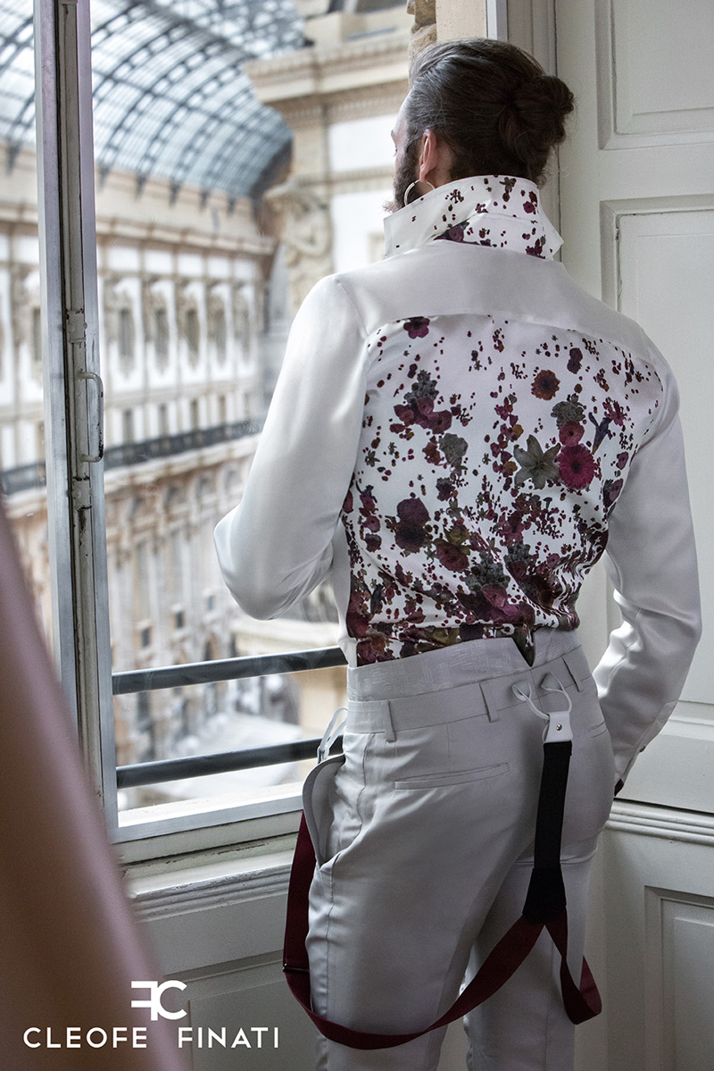 Innamoriamoci della particolarità della camicia in raso 100% seta bianco latte, una calma pulizia apparente che nasconde anche i bottoni con la sua copertura e ci meraviglia rivelandoci la stampa floreale ispirata a Kiki Smith su tutta la schiena, nell’interno polso, nella pistagna interna, esterna e nel sotto collo e regala la possibilità di stupire e ottenere diversi look nel giorno del matrimonio.