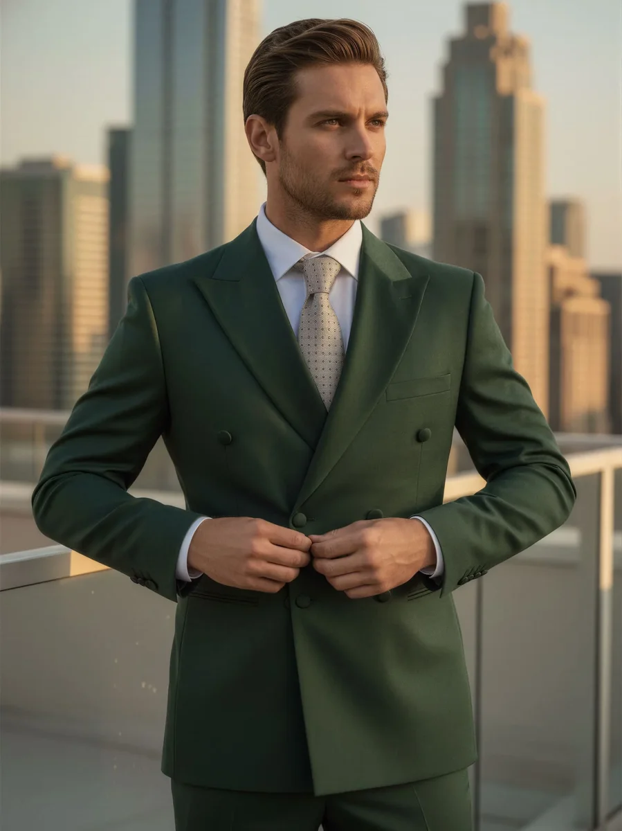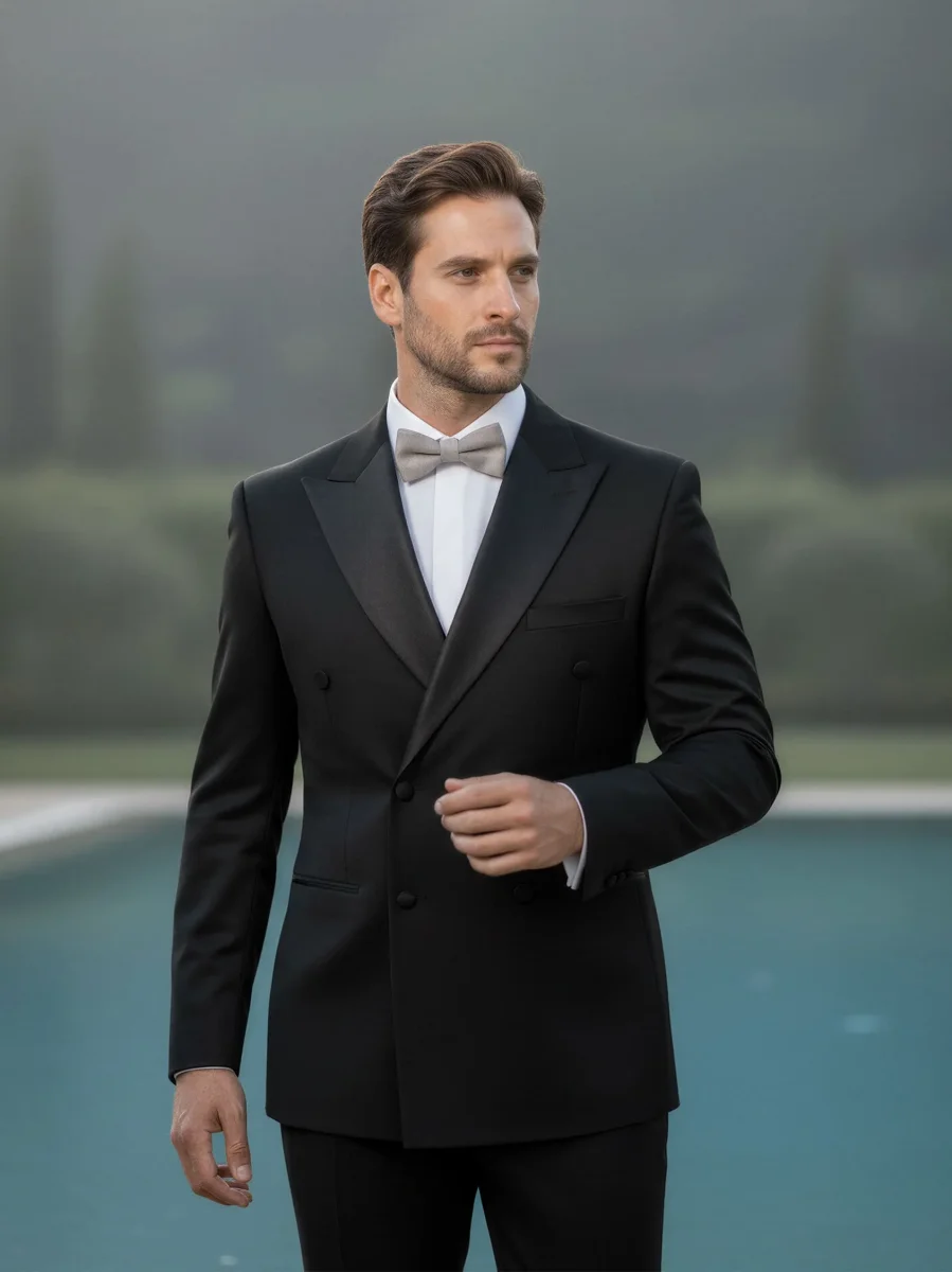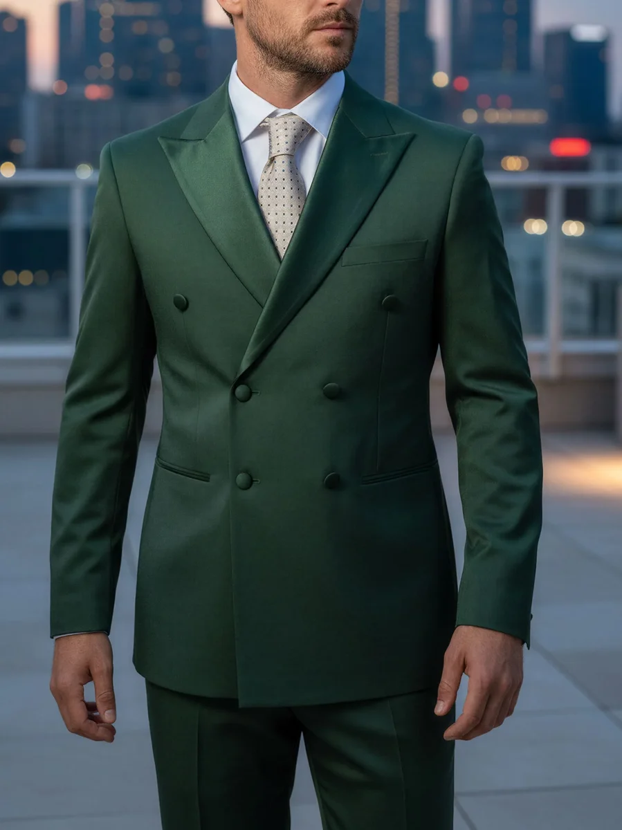 Modello: Abito con giacca doppio petto, bottoni in raso, petto a lancia in raso e due spacchi sul retro. Il pantalone si presenta con chiusura classica e al suo interno presenta 4 cm di tolleranza per poterlo allargare