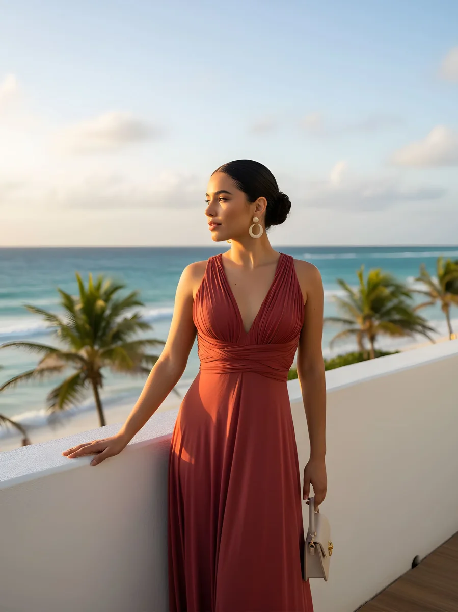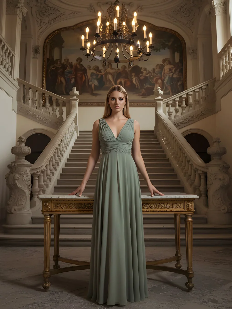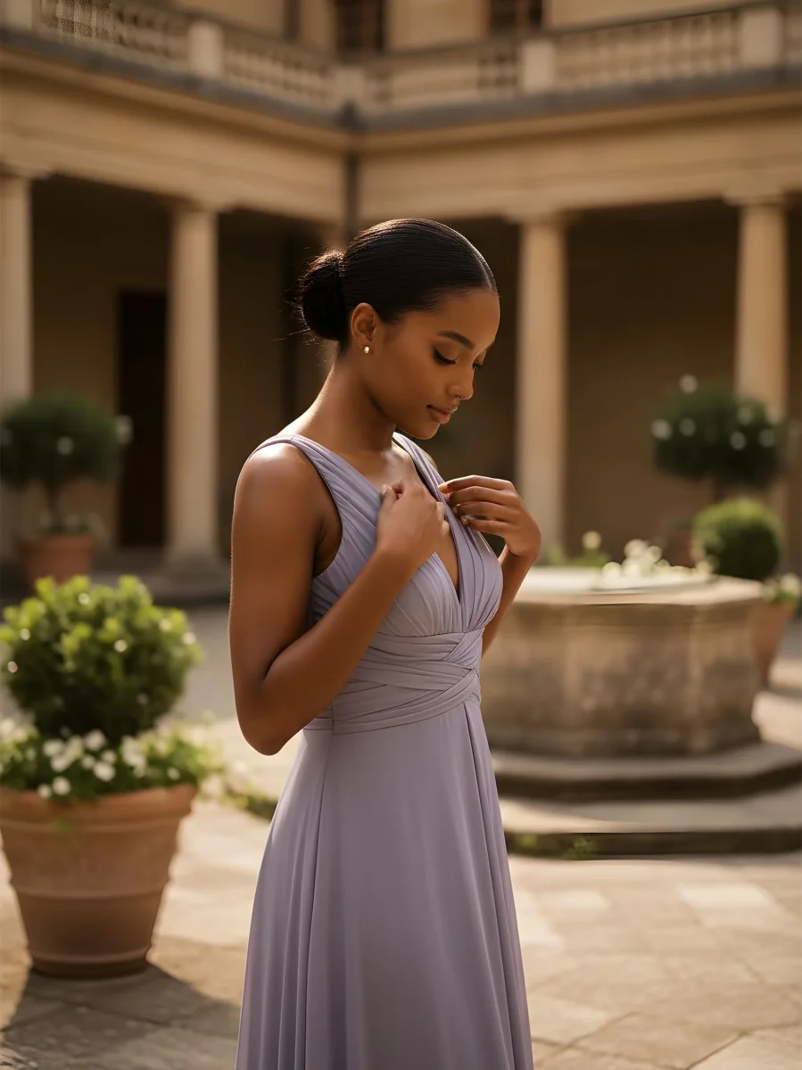 Modello: Abito lungo da cerimonia con scollo a V, drappeggio incrociato sul busto, spacco laterale e schiena scoperta a V, dal fascino fluido e contemporaneo, realizzato in morbido chiffon elasticizzato che accarezza la figura senza costringerla. Il corpetto, drappeggiato e incrociato sul davanti, valorizza il décolleté con una profonda scollatura a V, mentre il retro aperto aggiunge un tocco sensuale ed elegante. La gonna ampia con spacco laterale crea un movimento naturale a ogni passo, rendendo questo abito perfetto per eventi serali, matrimoni o occasioni speciali.