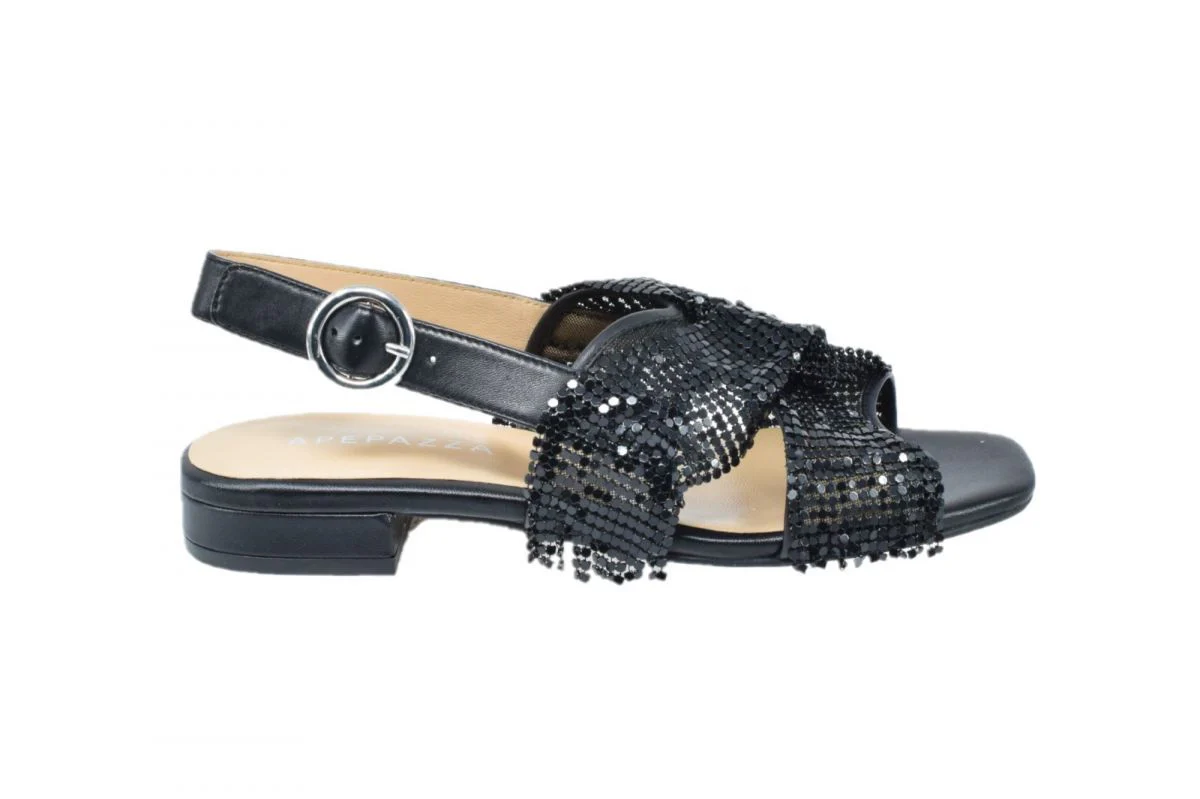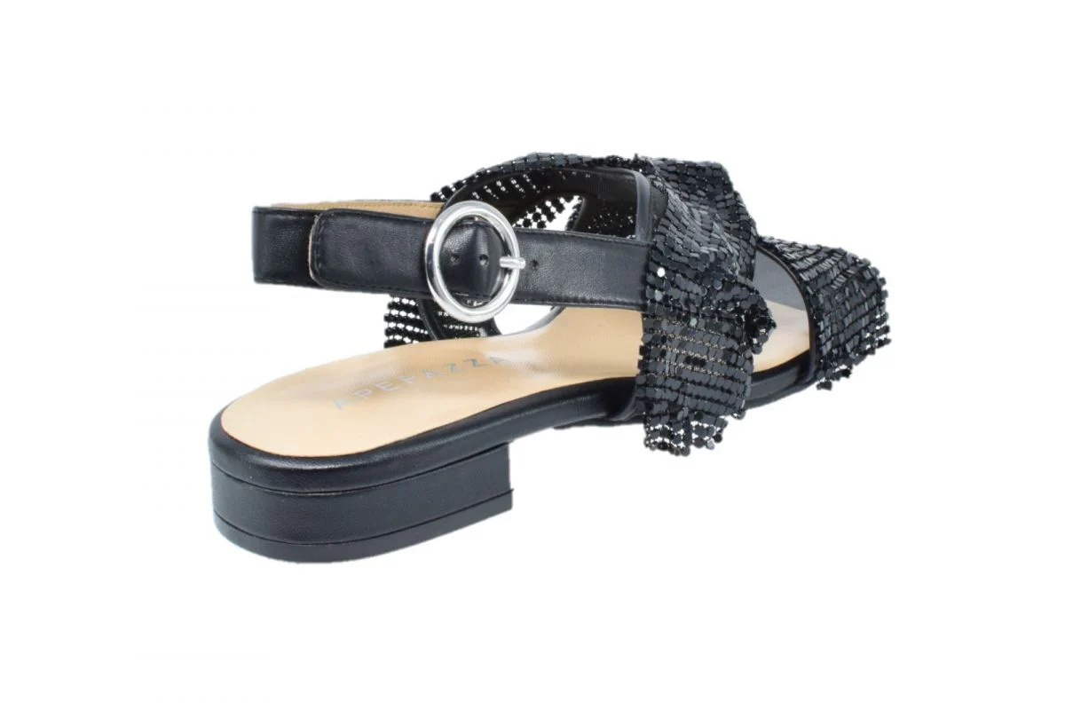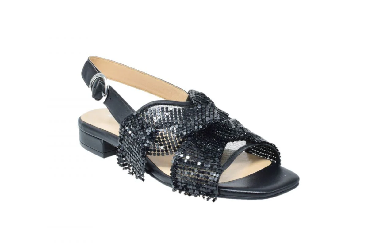 Sandalo gioiello in pelle con frange in rete metallica. Cinturino posteriore di regolazione e chiusura. Plantare in lattice e sottopiede in pelle. Punta squadrata, suola in cuoio con avampiede in gomma, tacco squadrato sporgente, altezza 30 mm.