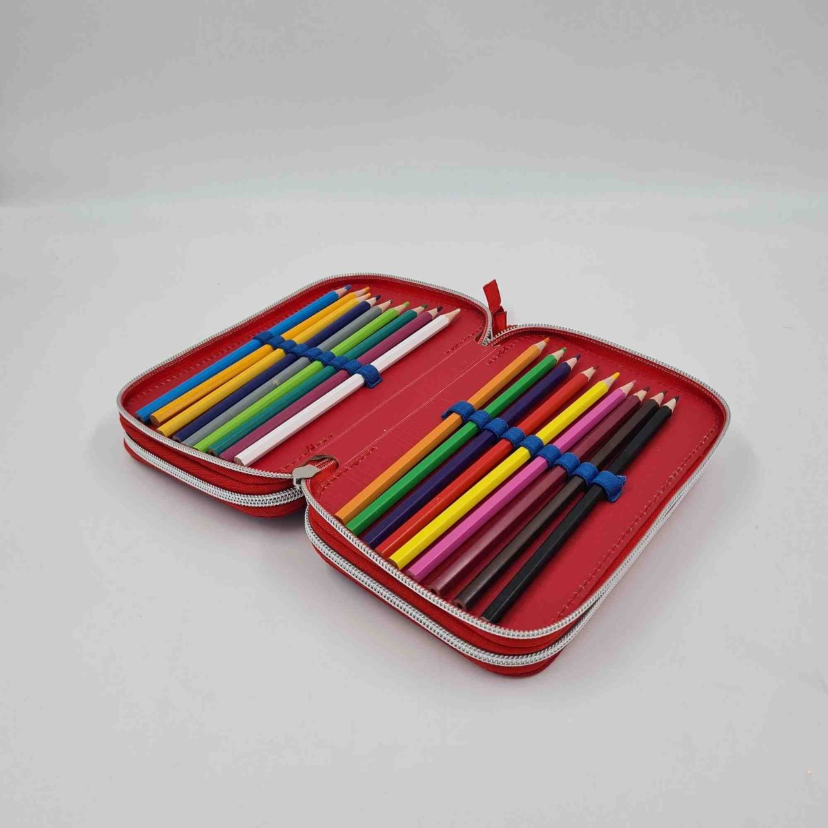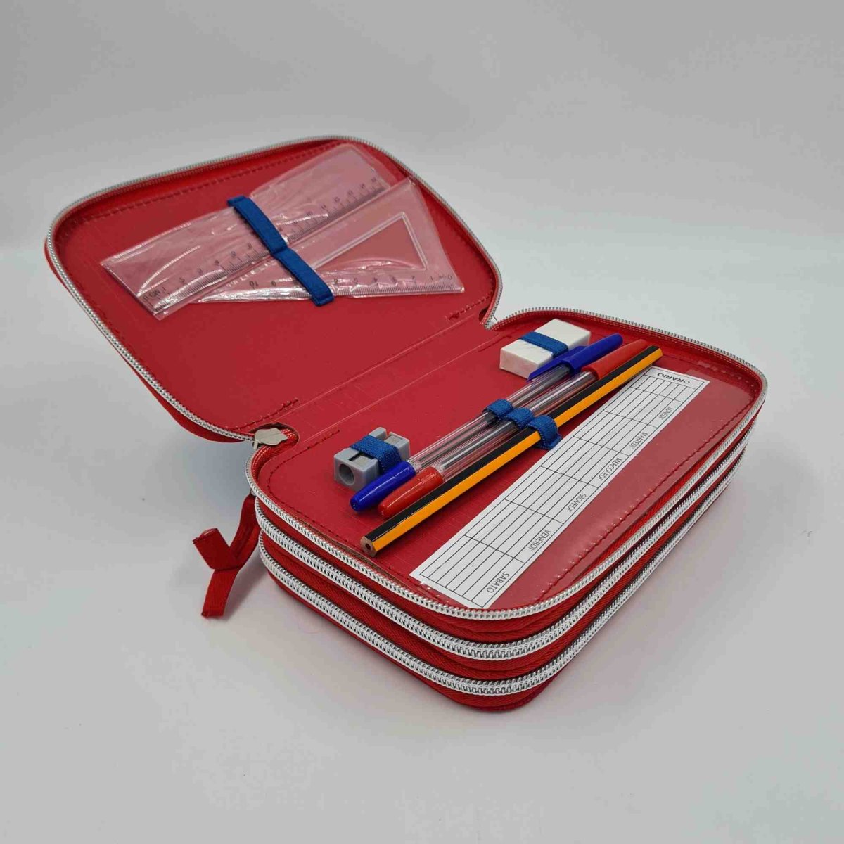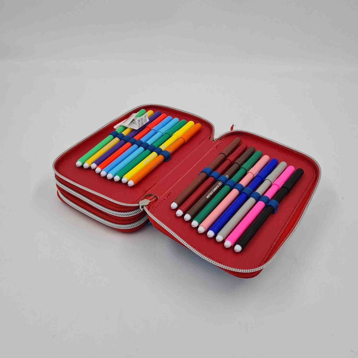 L’astuccio contiene 1 penna a sfera blu, 1 penna a sfera rossa, 1 matita, 1 gomma, 1 temperino, 1 righello, 1 squadretta, 1 “segnaorario”, 18 pastelli, 18 pennarelli Giotto.