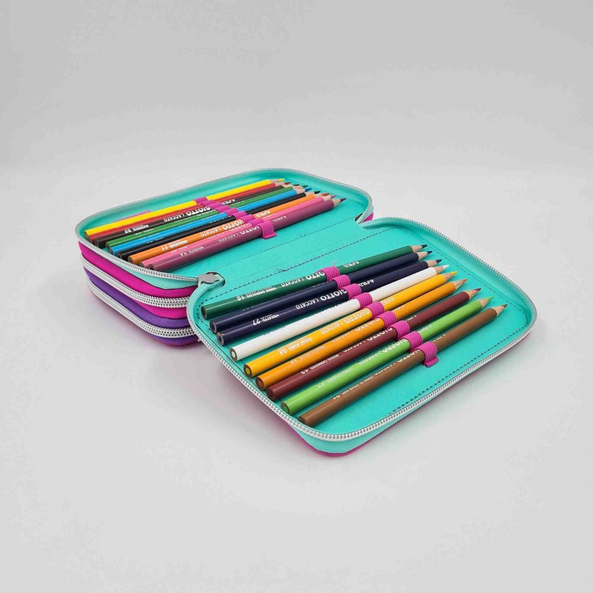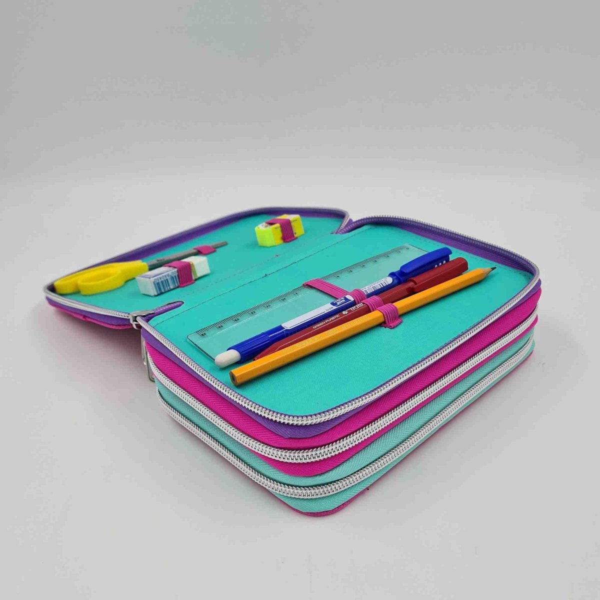 L’astuccio contiene 1 penna a sfera blu, 1 penna a sfera rossa, 1 matita, 1 gomma, 1 temperino, 1 righello, 1 squadretta, 1 “segnaorario”, 18 pastelli, 18 pennarelli Giotto.