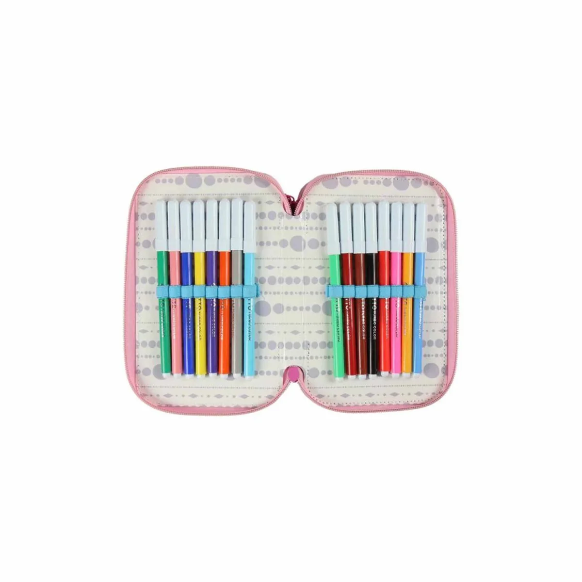 L’astuccio contiene 1 penna a sfera blu, 1 penna a sfera rossa, 1 matita, 1 gomma, 1 temperino, 1 righello, 1 squadretta, 1 “segnaorario”, 18 pastelli, 18 pennarelli Giotto.
