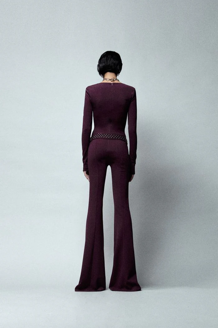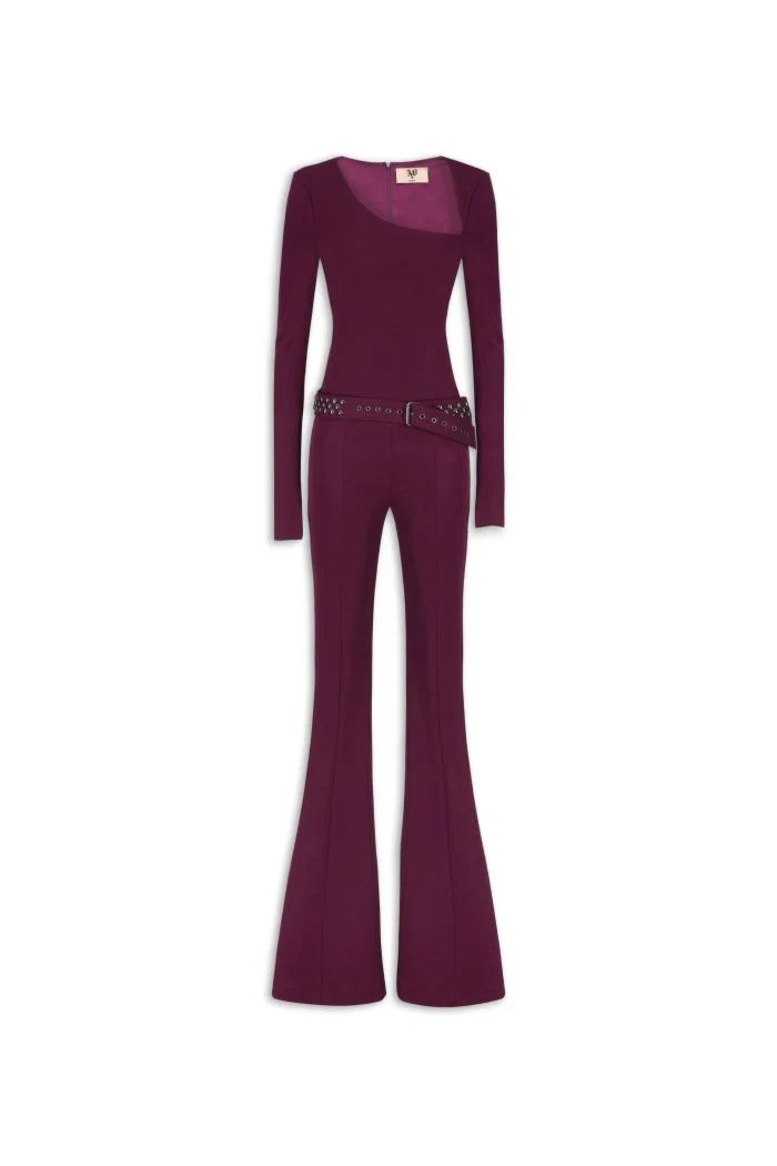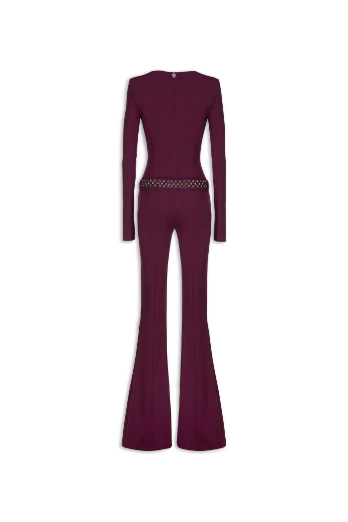 TUTA A MANICHE LUNGHE E PANTALONE A ZAMPA REALIZZATA IN SCREPPINO. MODELLO ARRICCHITO DA UNA CINTURA BORCHIATA IN VITA CHE VALORIZZA LA FIGURA.