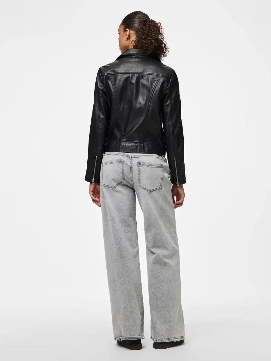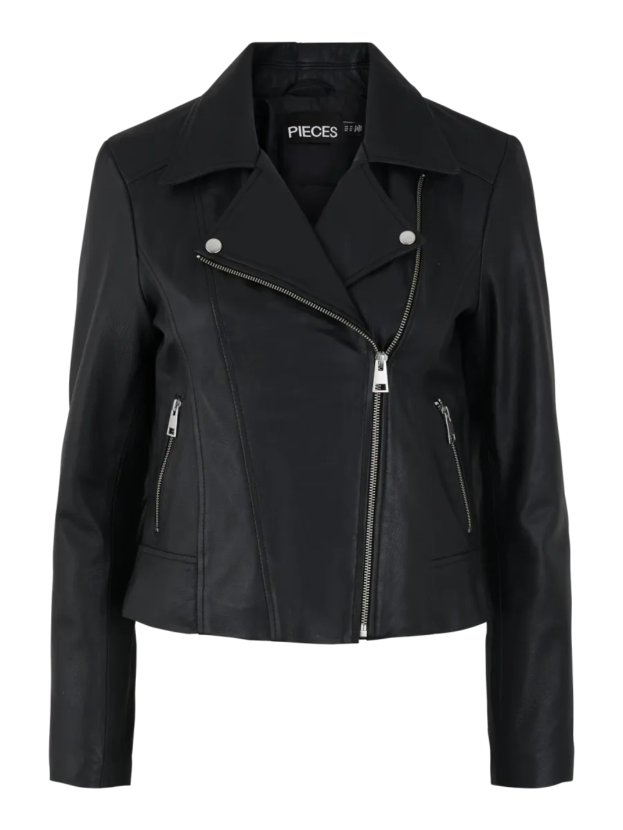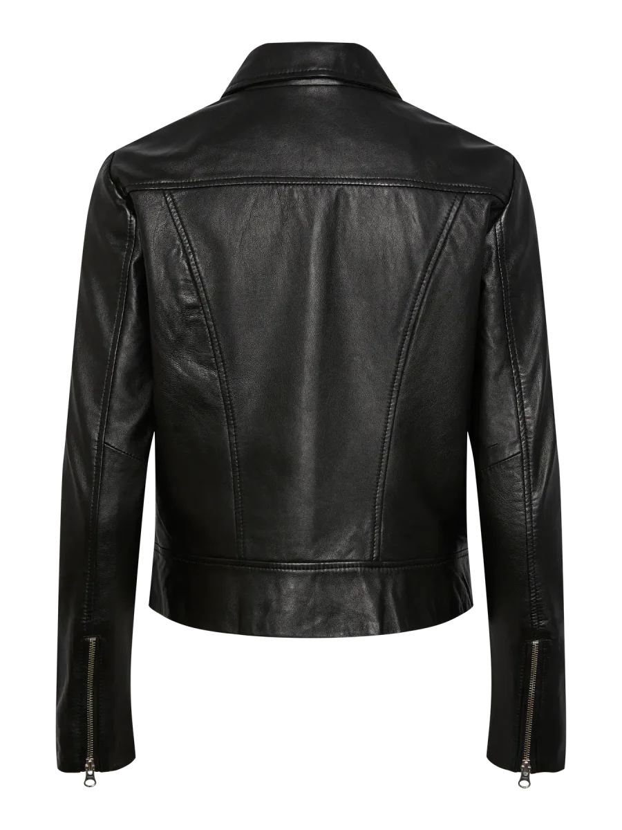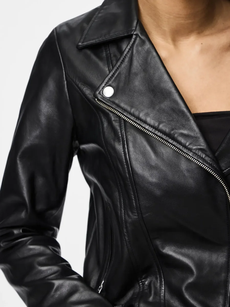 Giacca in pelle, scollo V, manica lunga con chiusura con bottoni e zip
