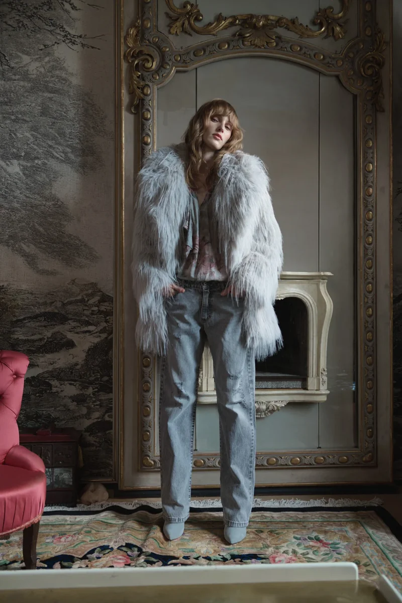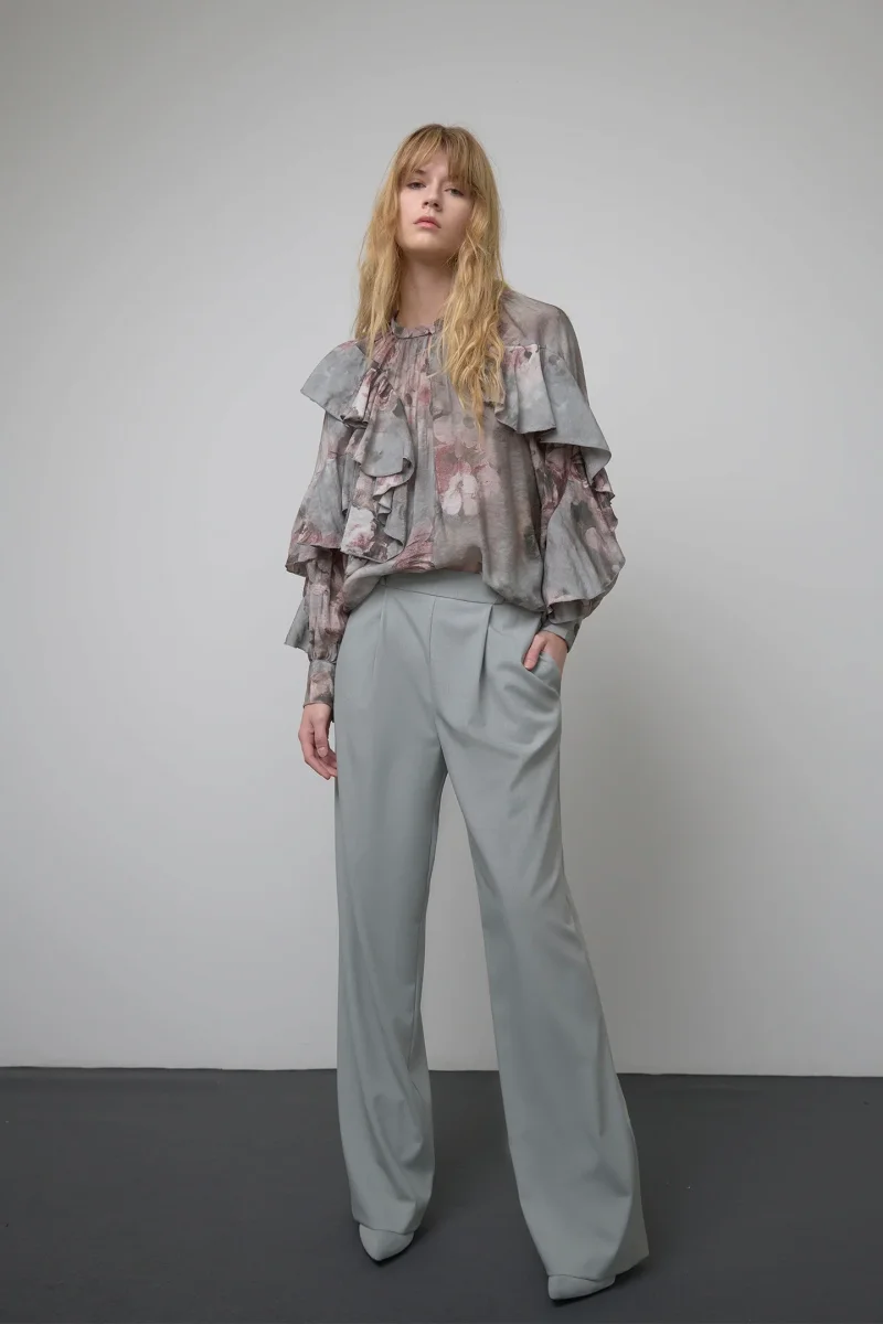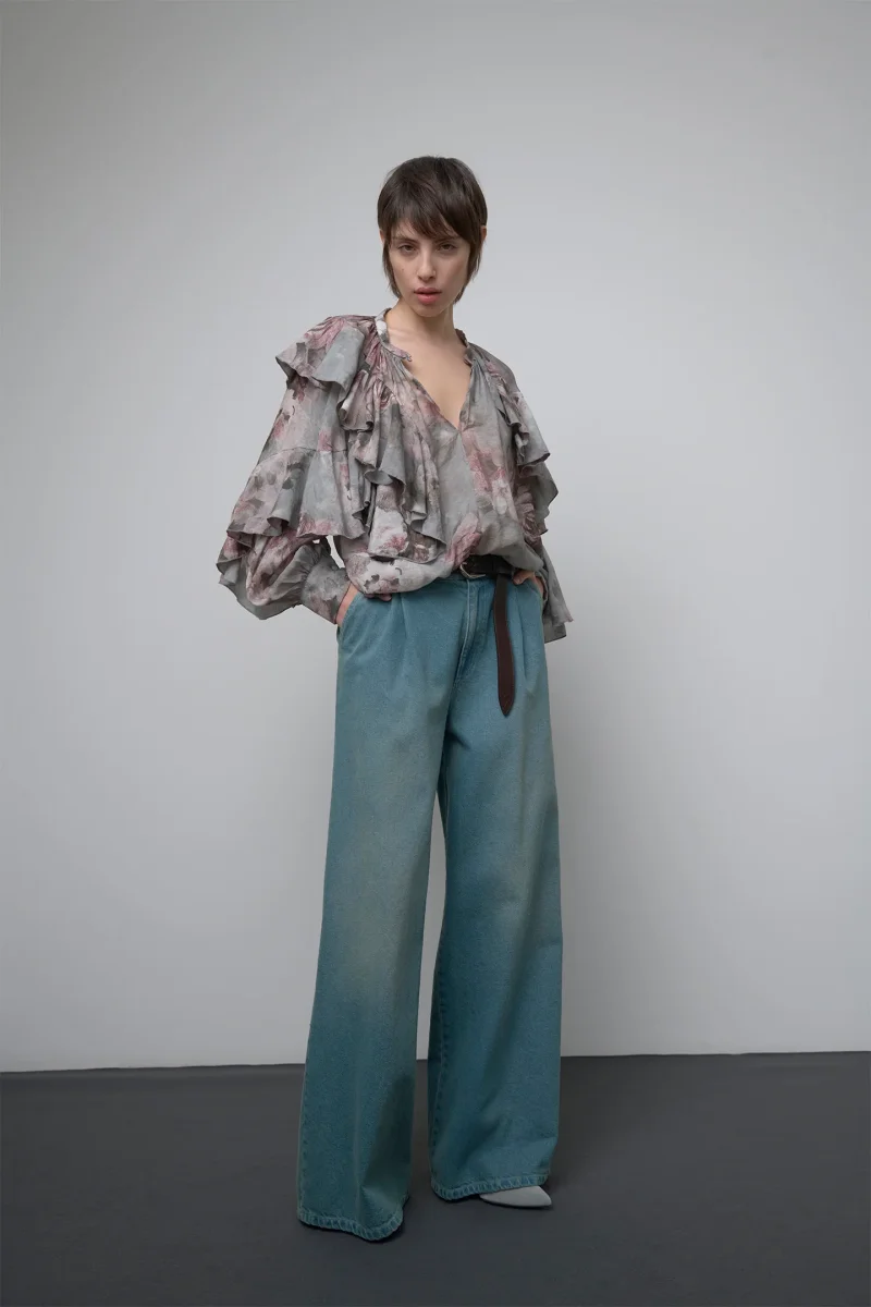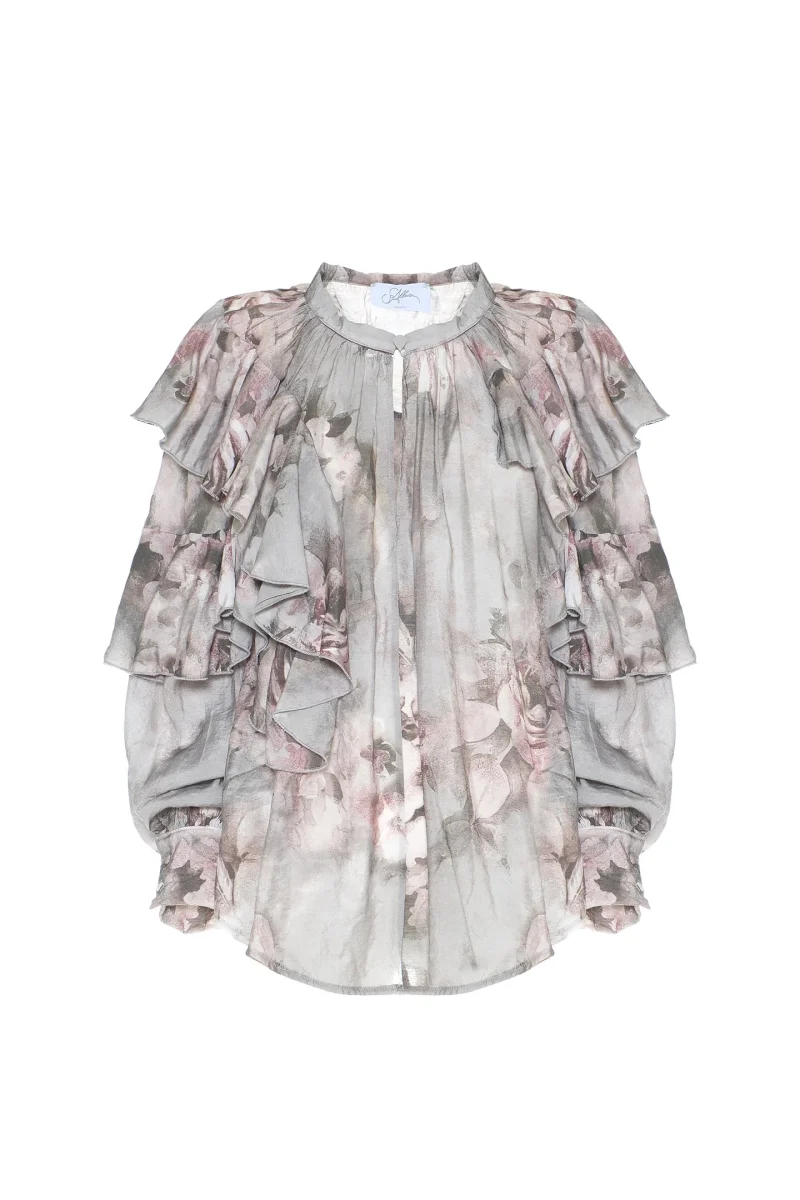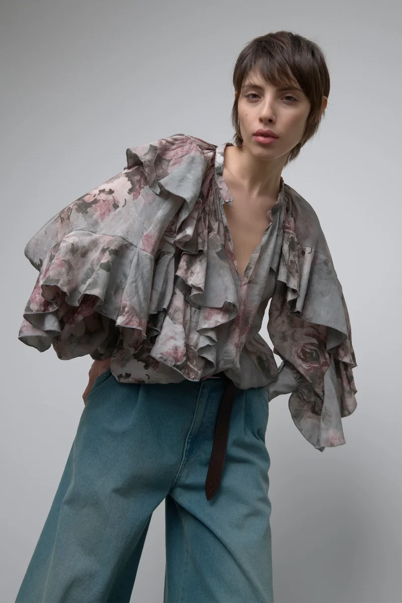 CARATTERIZZATA DA AMPI VOLANT CHE SI ESTENDONO SUL DAVANTI E SUL RETRO FINO ALLE MANICHE LUNGHE, RIFINITE CON POLSINI ABBOTTONATI.