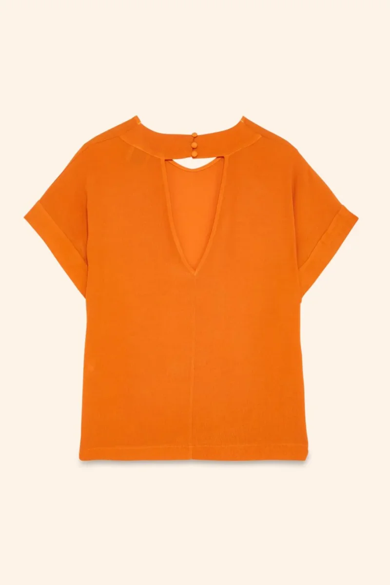 Blusa girocollo mezza manica in crepe marocaine di viscosa, manica a kimono con bordo alto e scollo con bottoni fasciati sul centro dietro.
