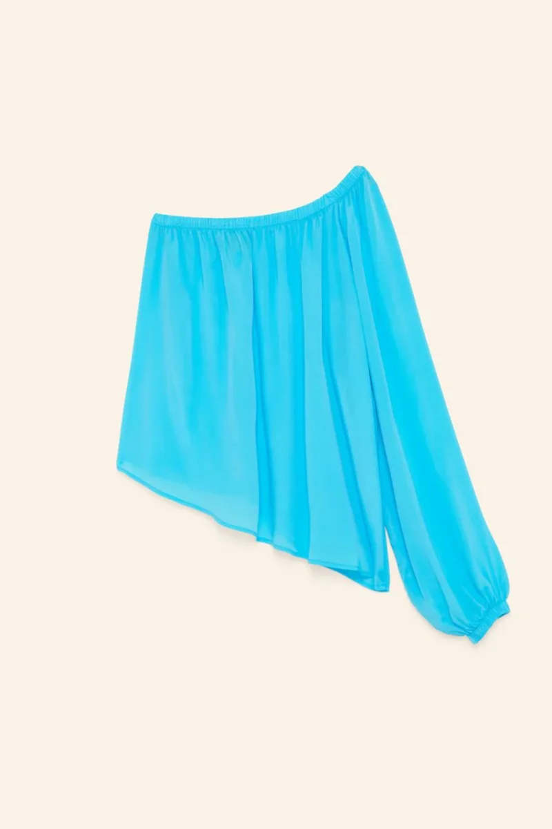 Blusa monospalla in crepe viscosa/seta dal fondo asimetrico ed elastico al polso ed allo scollo.