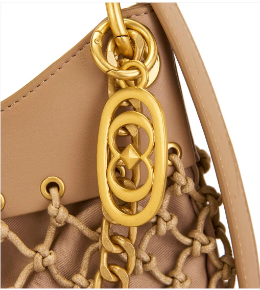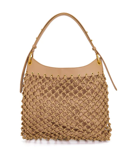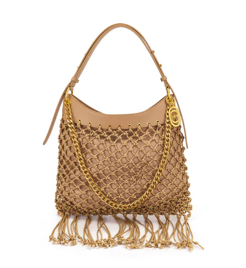 Borsa a spalla di corda intrecciata con frange, manico e tracolla rimovibile