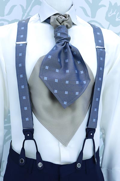 Ne sono un esempio queste bretelle couture in broccato, 100% seta, dal fondo caratterizzato da una micro fantasia a rombi blu notte e beige dorato, solcata da piccoli quadrati che spiccano grazie ad un elegante azzurro, sia con finali in pelle blu che clip.