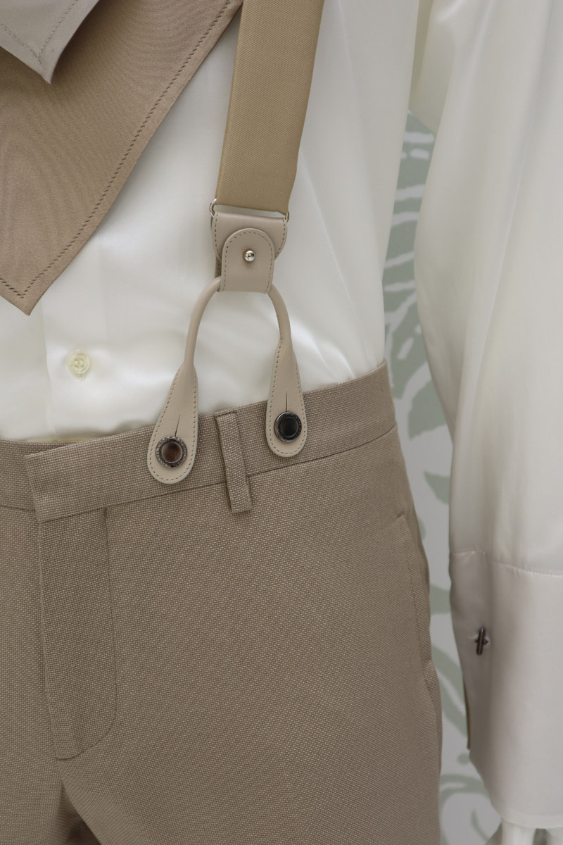 Ne sono un esempio queste bretelle couture in raso di lana e seta havana, che mostra tinte azzurro spento e sabbia, sia con finali in pelle crema che clip.