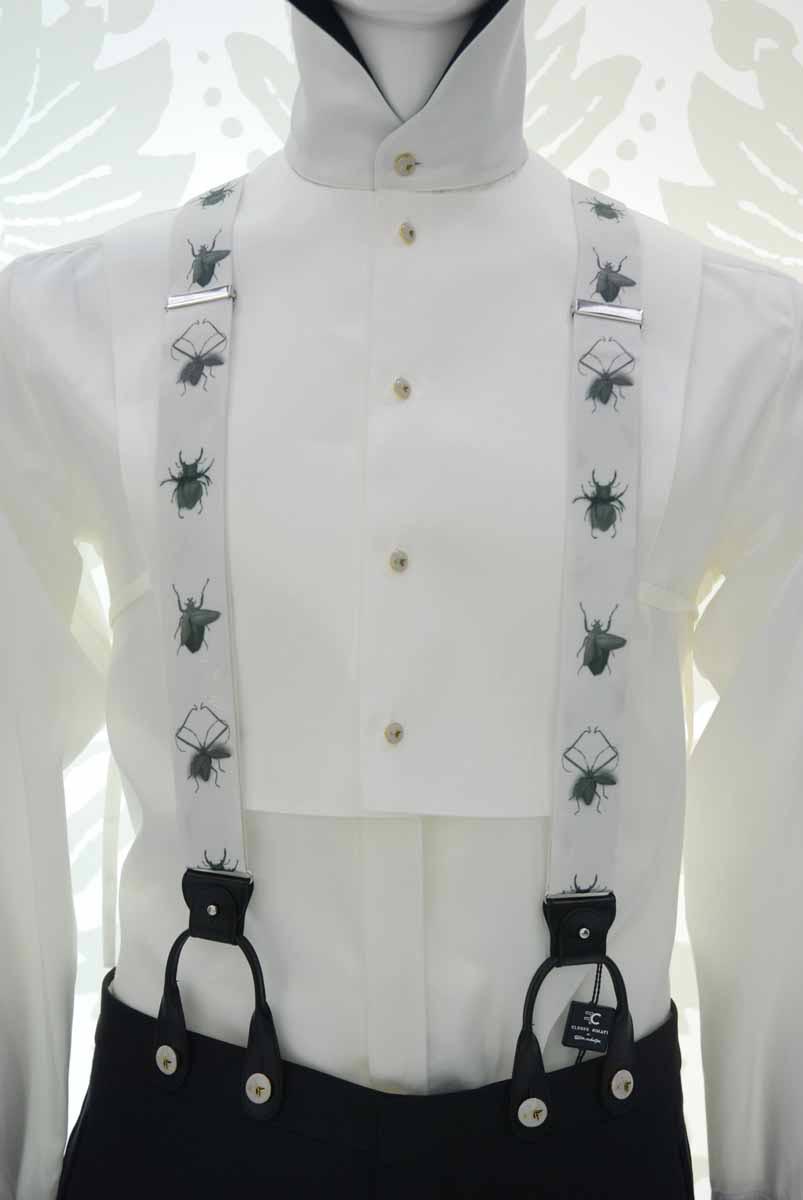 Ne sono un esempio queste bretelle glamour in un tessuto con mischie di viscosa e cupro, solcate da figure surreali, si tratta della stampa di insetti che possiedono al posto delle ali, petali di tulipani o boccioli di rosa veri e propri, per un effetto iperrealistico, sia con finali in pelle nera che clip, che ti donano un look ricercato e nel contempo molto glamour.