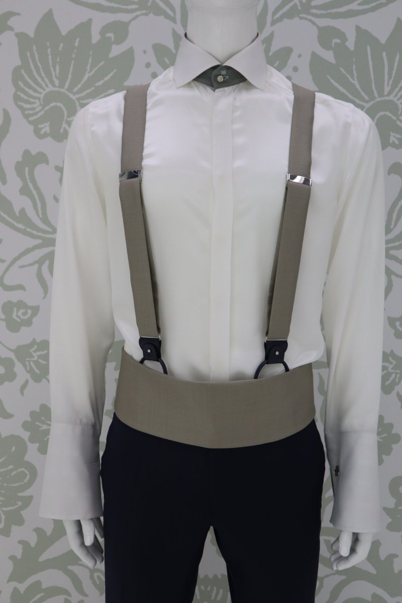 Bretelle da cerimonia uomo Cleofe Finati grigio champagne pensate per completare l’abito da sposo con eleganza, carattere e cura sartoriale. Un accessorio distintivo, ideale per matrimoni ed eventi formali, progettato per garantire comfort, stabilità e uno stile raffinato.