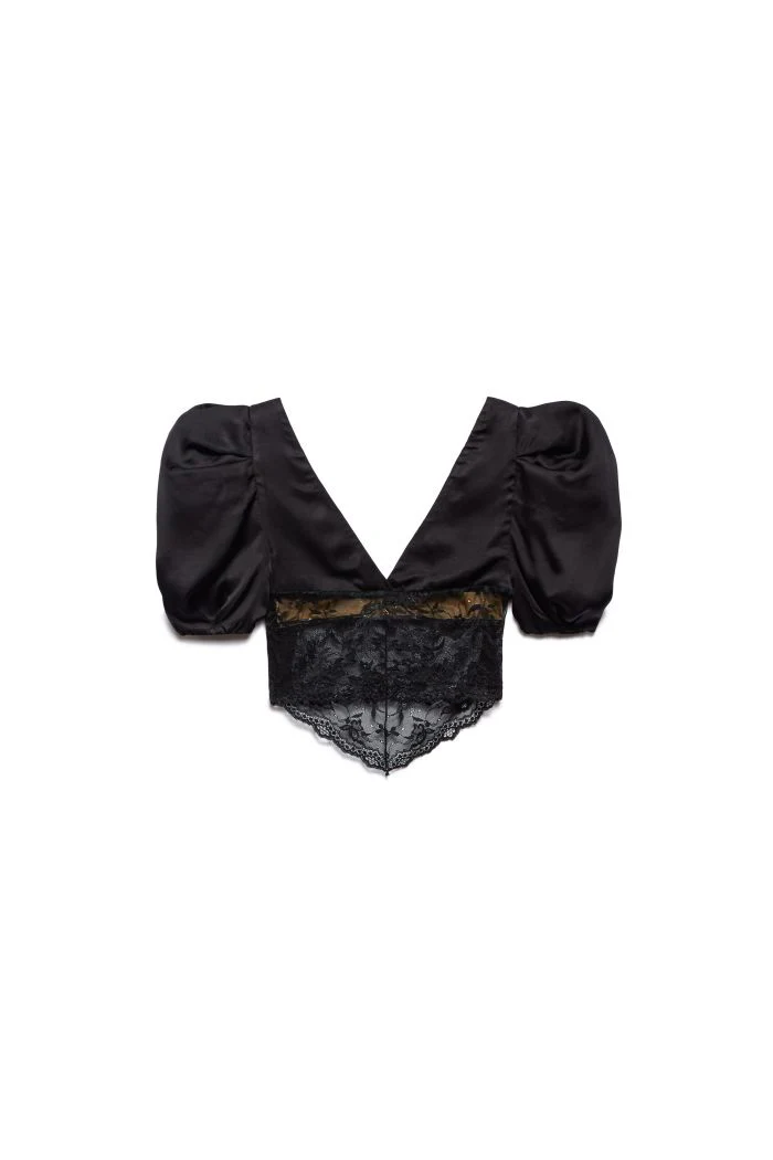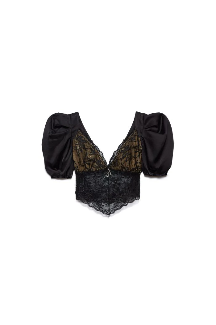 ELEGANZA GOTICA E SEDUZIONE MODERNA. IL TOP TARA È REALIZZATO IN PIZZO E SI CARATTERIZZA PER LA LINEA BUSTIER CON SCOLLO A V IMPREZIOSITO DAL CHARM LOGATO. L’ORLO A PUNTA SLANCIA LA FIGURA, MENTRE LE MANICHE A PALLONCINO IN RASO DANNO UN TOCCO DRAMMATICO AL LOOK.