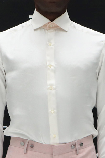 Camicia abito da sposo uomo in raso di seta cotone panna con interno polso, interno ed esterno collo in raso tinto filo di seta lana rosa made in Italy 100%, nota la sua bellissima linea slim fashion da indossare in modo alternativo anche all’esterno del pantalone.