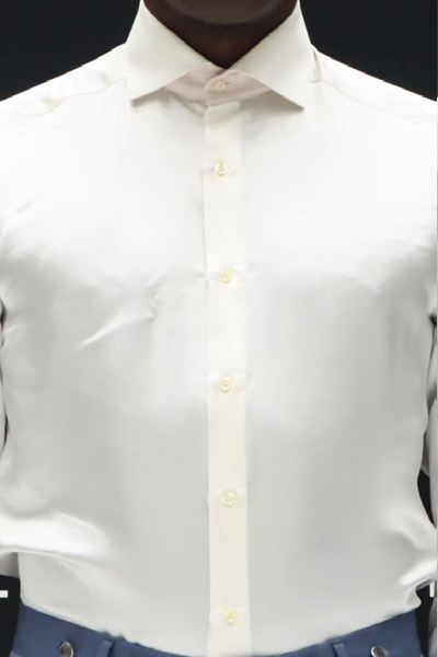 Camicia abito da sposo uomo in raso di seta cotone panna con interno polso, interno ed esterno collo in broccato di seta made in Italy 100%, nota la sua bellissima linea slim fashion da indossare in modo altrnativo anche all’esterno del pantalone.