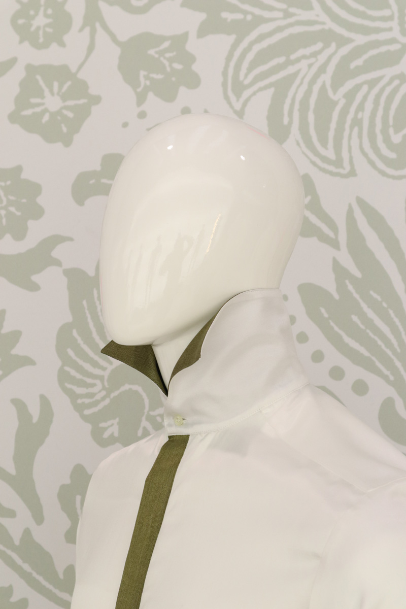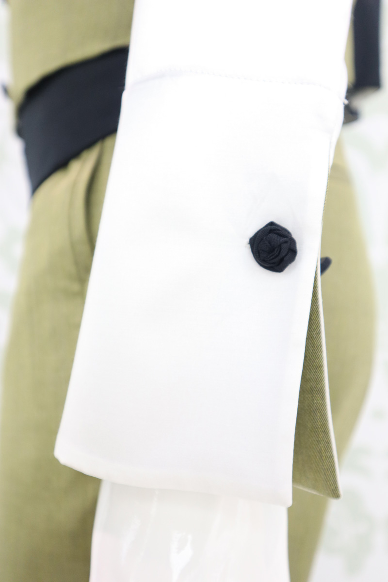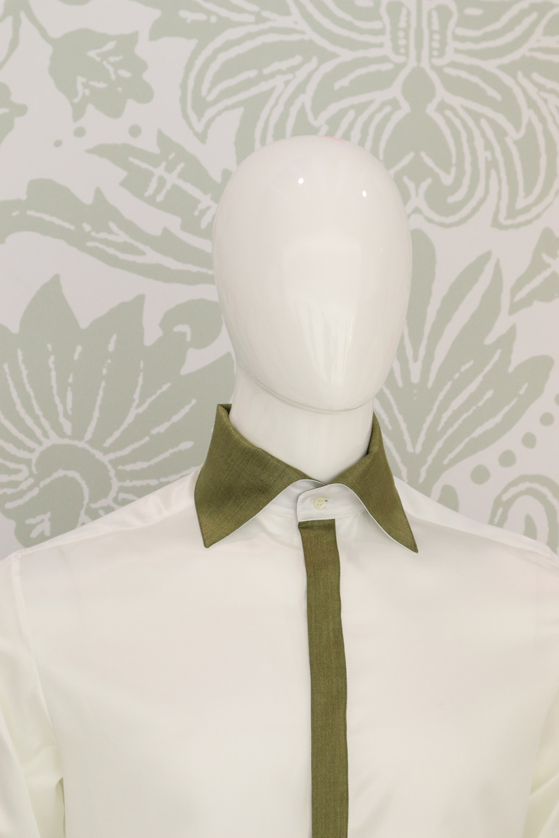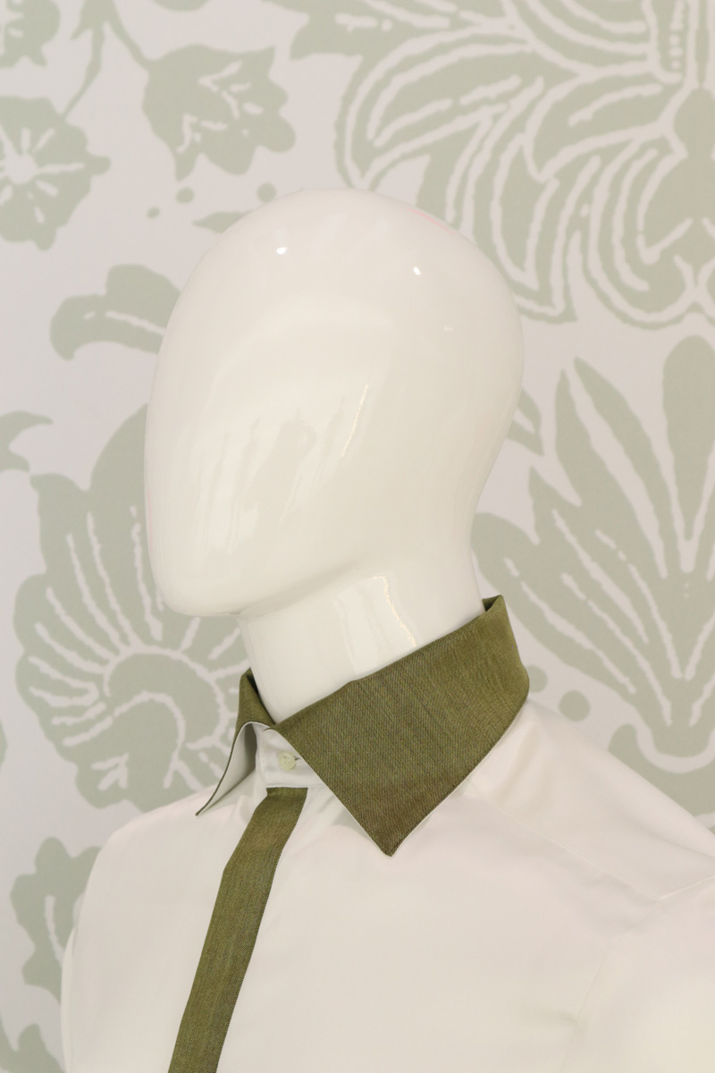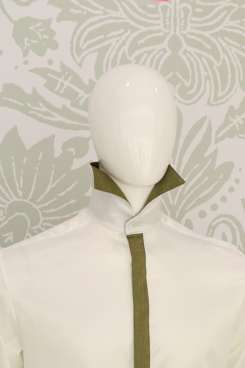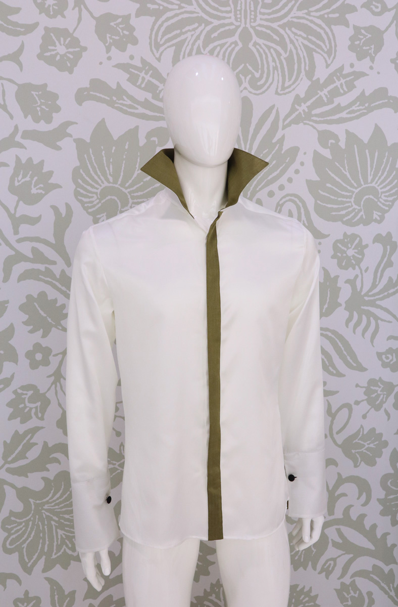 Camicia uomo in un luminoso bianco latte di raso di seta e cotone, avvolge il corpo e lascia ammirare gli interni polsi, la pistagna interna ed esterna e la copertura dei bottoni, che contrastano con un raso di lana seta elastico oro in perfetta combinazione con panciotto e cravatta.