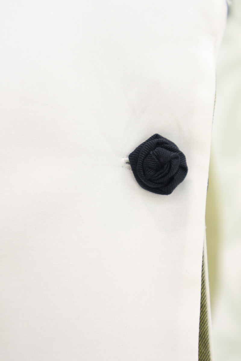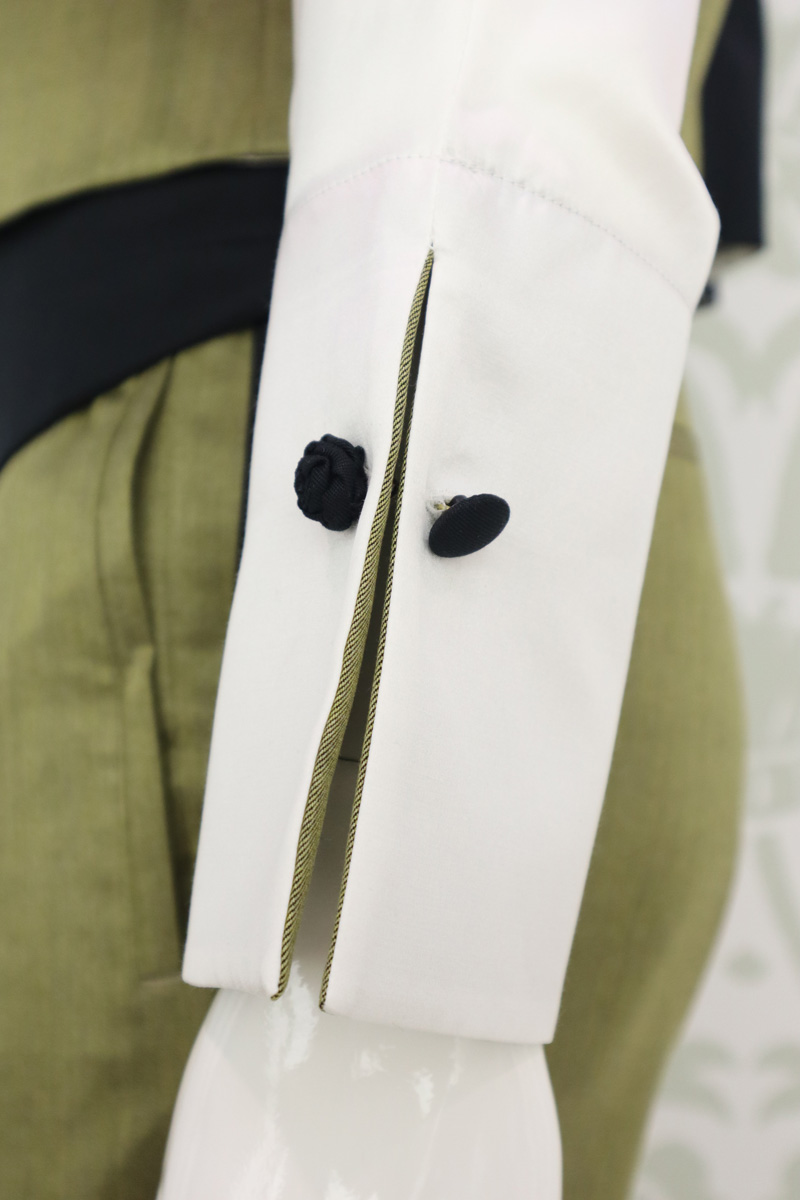 - Pistagna interna ed esterna, interno polsi e copertura bottoni in raso di lana seta elastico oro
