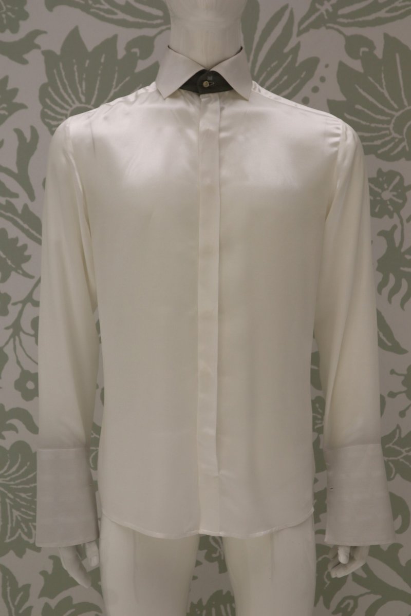 Camicia uomo da cerimonia  Cleofe Finati color avorio, progettata per completare l’abito da sposo con coerenza stilistica e raffinatezza perfettamente abbinabile con l’abito da sposa.