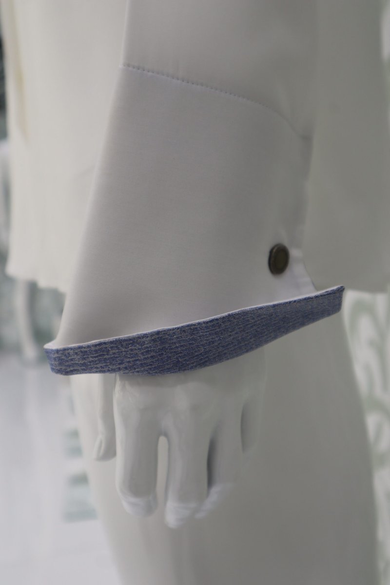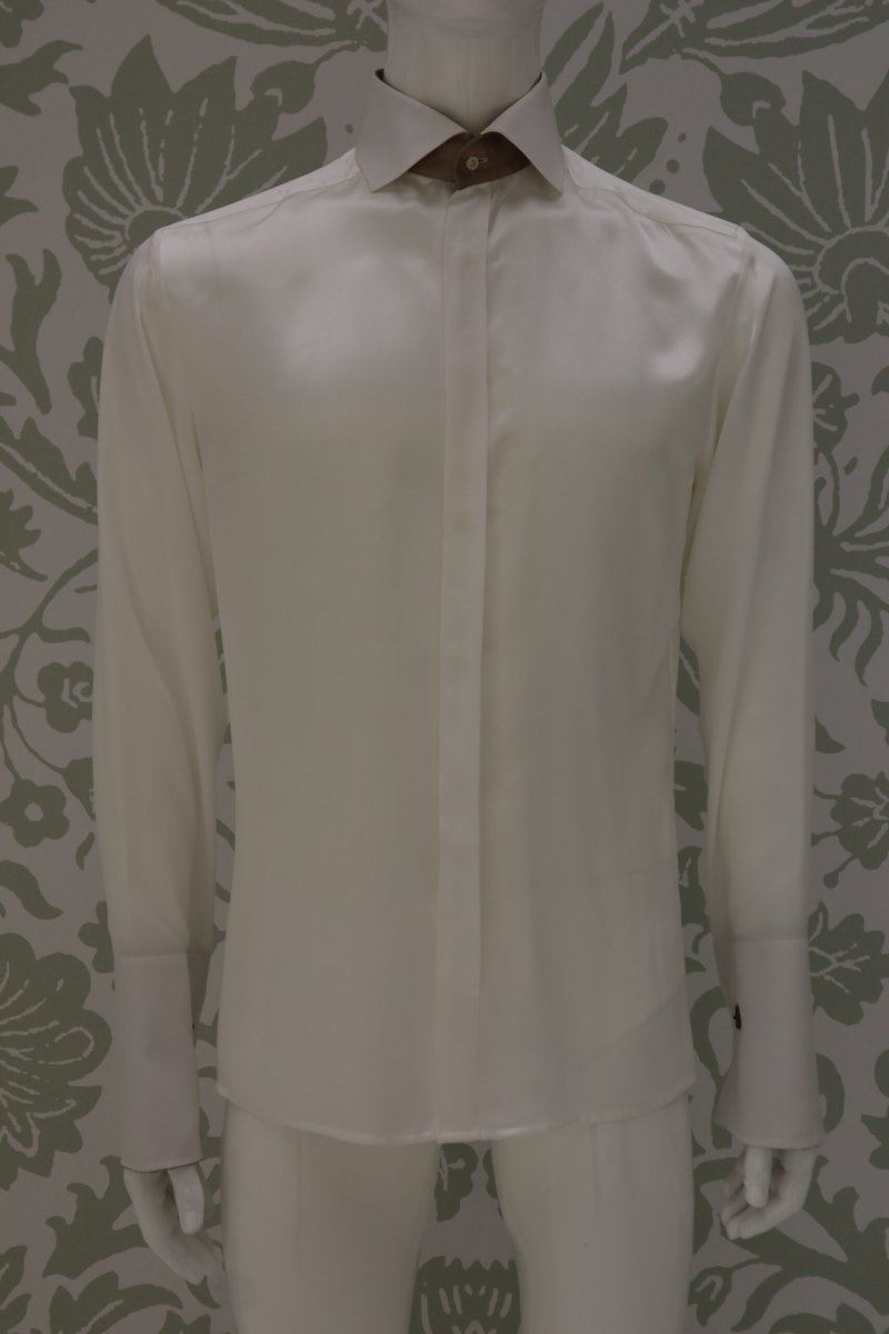 Camicia color avorio da cerimonia uomo Cleofe Finati in perfetto abbinamento con il colore dell’abito della sposa, pensata per accompagnare l’abito da sposo con eleganza, comfort e precisione sartoriale. Realizzata con tessuti di alta qualità, offre una vestibilità studiata per valorizzare la figura maschile ed è ideale per matrimoni ed eventi formal. Notare dettagli su interno polso / collo