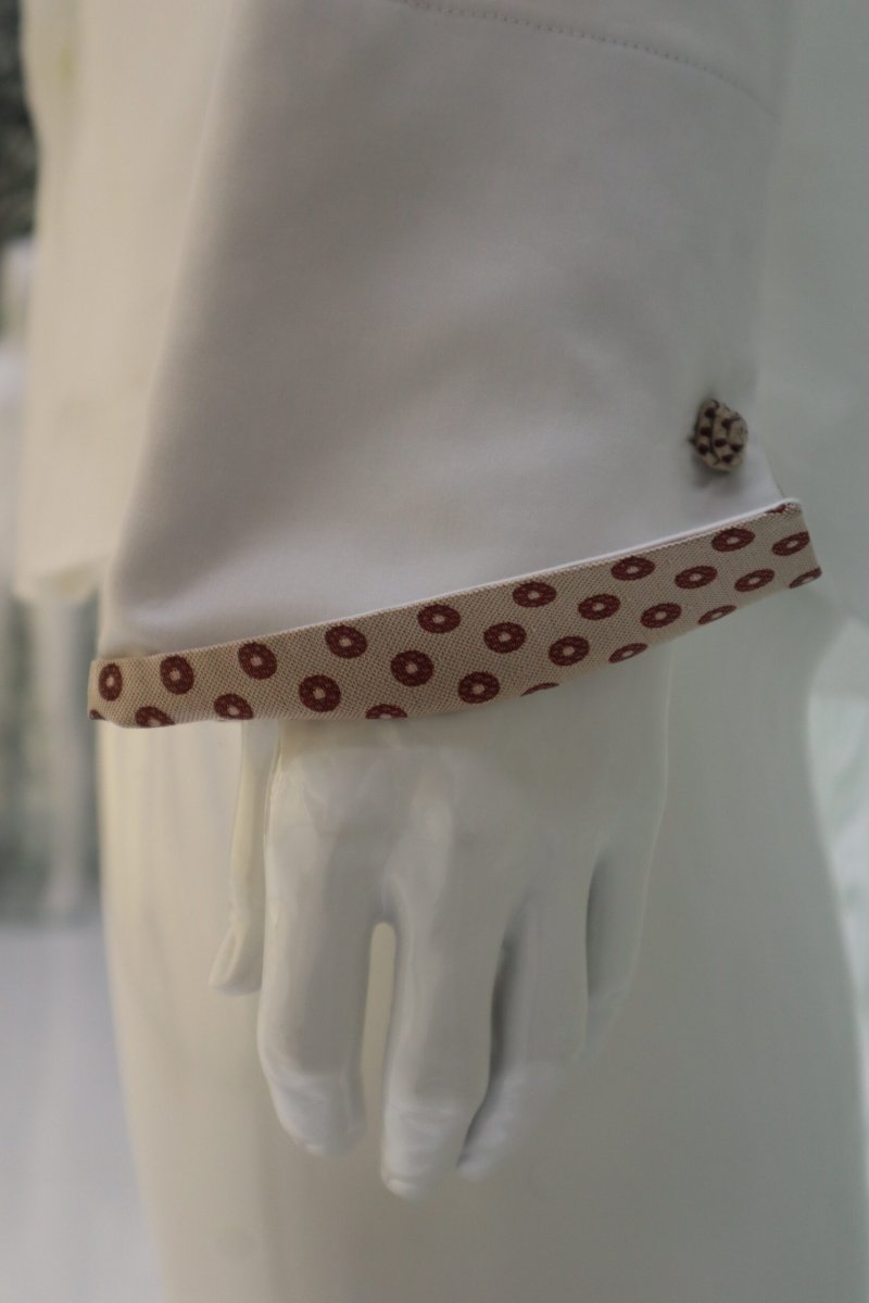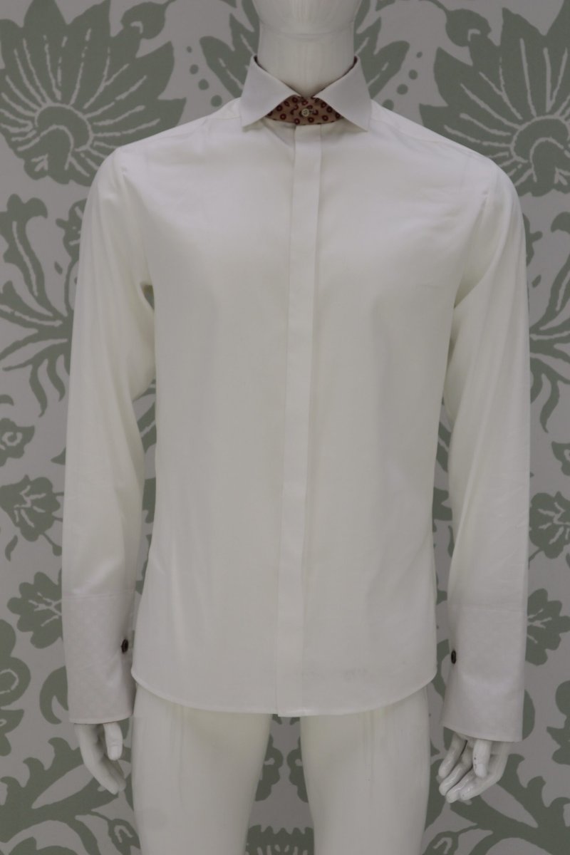 Camicia da cerimonia uomo Cleofe Finati, pensata per accompagnare l’abito da sposo con eleganza, comfort e precisione sartoriale. Realizzata in 100% cotone bianco latte è arricchita da applicazioni coordinate nei dettagli nascosti della pistagna interna, esterna e polsi, creando un gioco discreto di richiami cromatici.