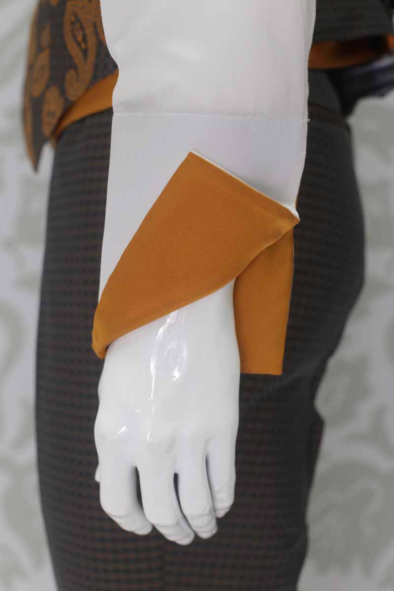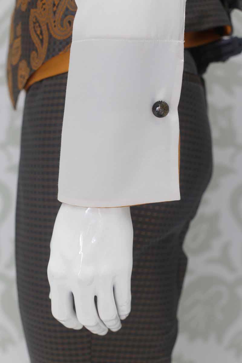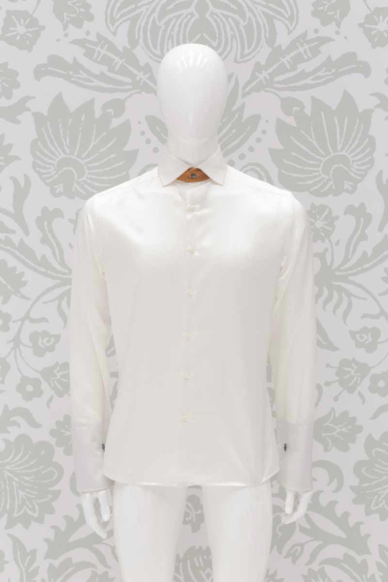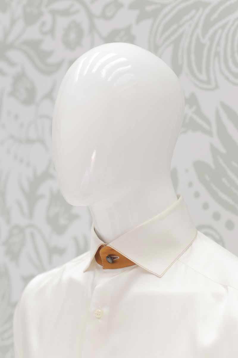 Una candida camicia in raso di seta (51%) e cotone (49%) bianco latte avvolge il tuo corpo e lascia intravedere la bellezza delle sue applicazioni quali pistagna interna, esterna ed interno polsi in un lucente raso 100% seta color ocra dorato, in perfetta combinazione con panciotto e cravatta.