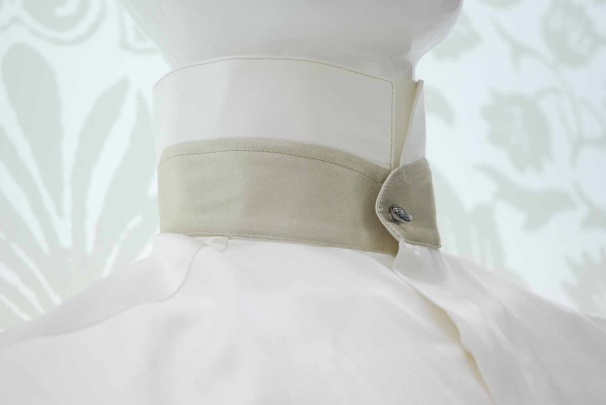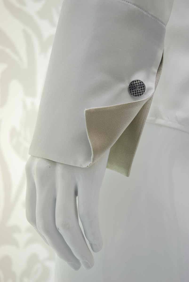 Una candida camicia in raso di seta (51%) e cotone (49%) bianco latte avvolge il tuo corpo e lascia intravedere la bellezza delle sue applicazioni quali pistagna esterna ed interno polsi in un lucente raso 100% seta color champagne, impreziosita da bottoni e gemelli gioiello, in perfetta combinazione con panciotto e cravatta.