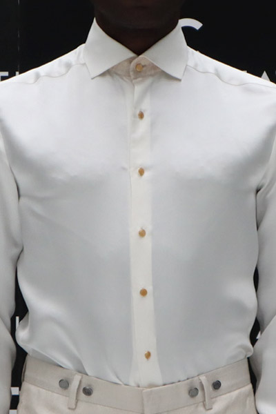 Camicia abito da sposo uomo in raso di seta e cotone linea fashion slim con interno polso, interno ed esterno collo in broccato di seta made in italy 100%, da indossare in modo versatile anche all’esterno del pantalone.